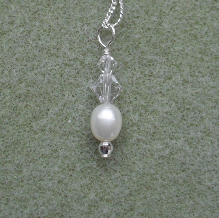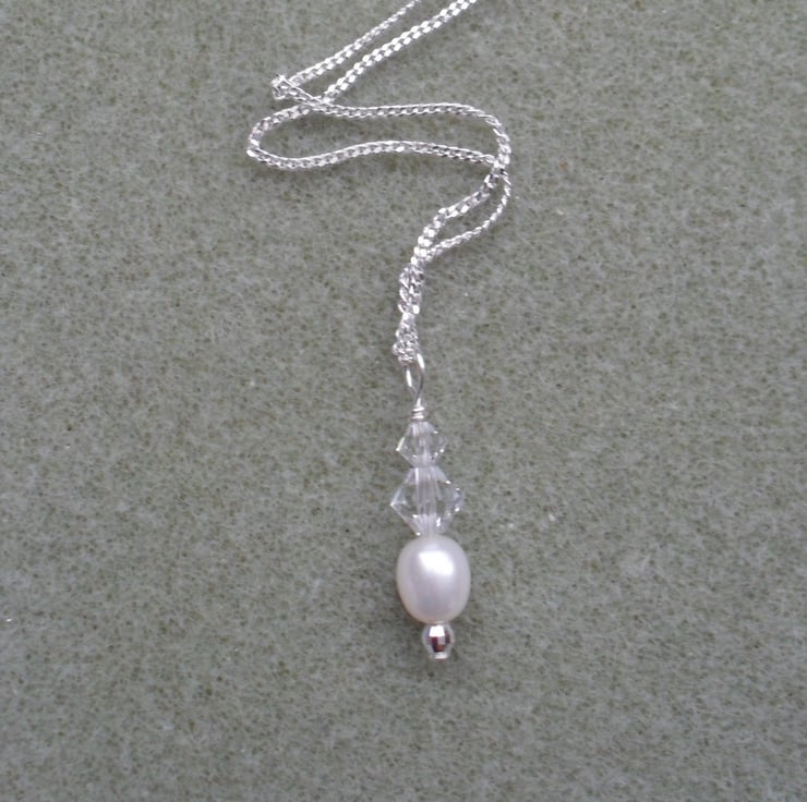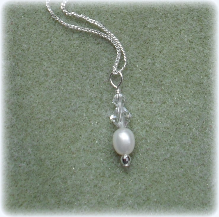Swarovski crystals and a freshwater cultured pearl are suspended from a 16 inch sterling chain
