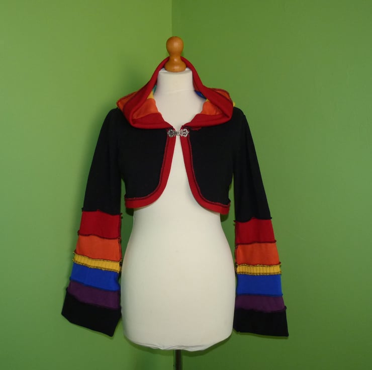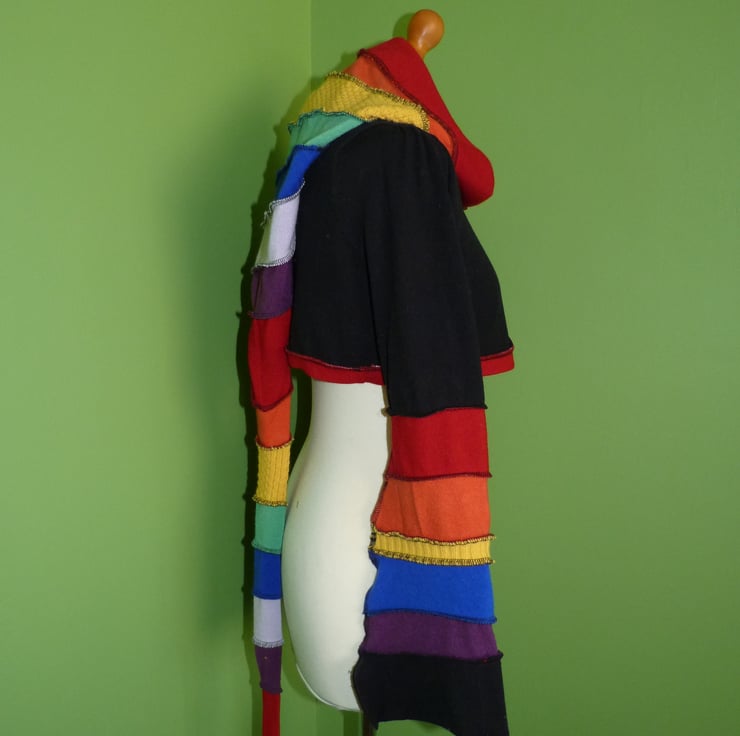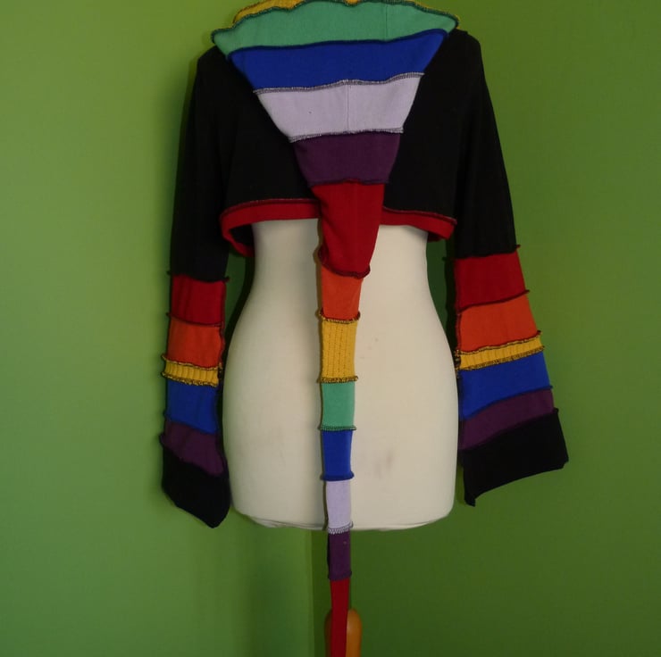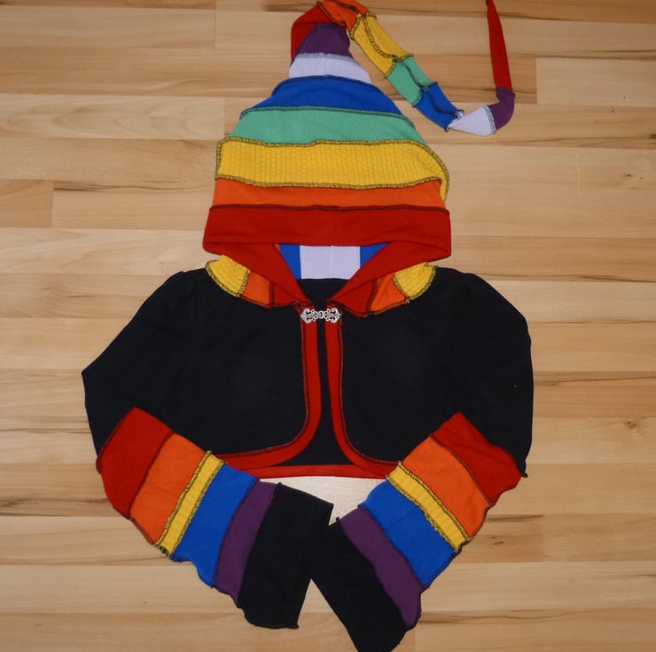 The jumpers are really soft and cosy, and have been carefully selected in the colours of the rainbow, on a black bodice. There is a long hood, bell bottom sleeves with a thumb hole, and a decorative metal hook and clasp closure .