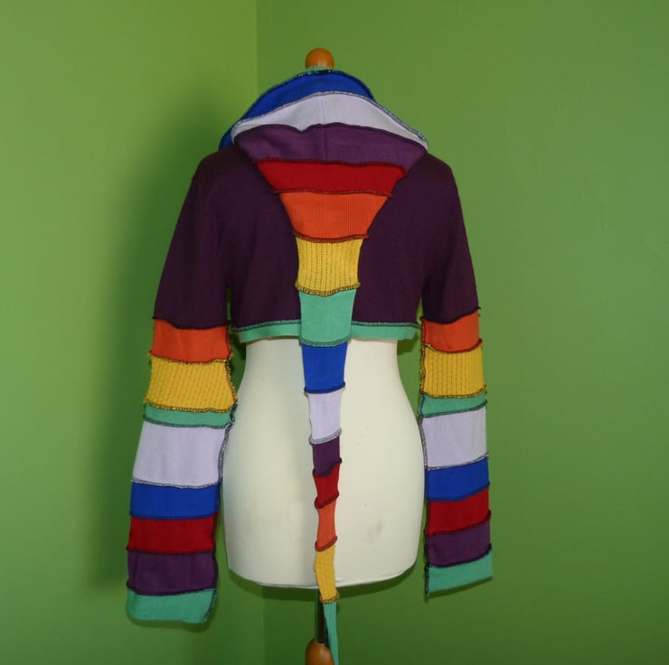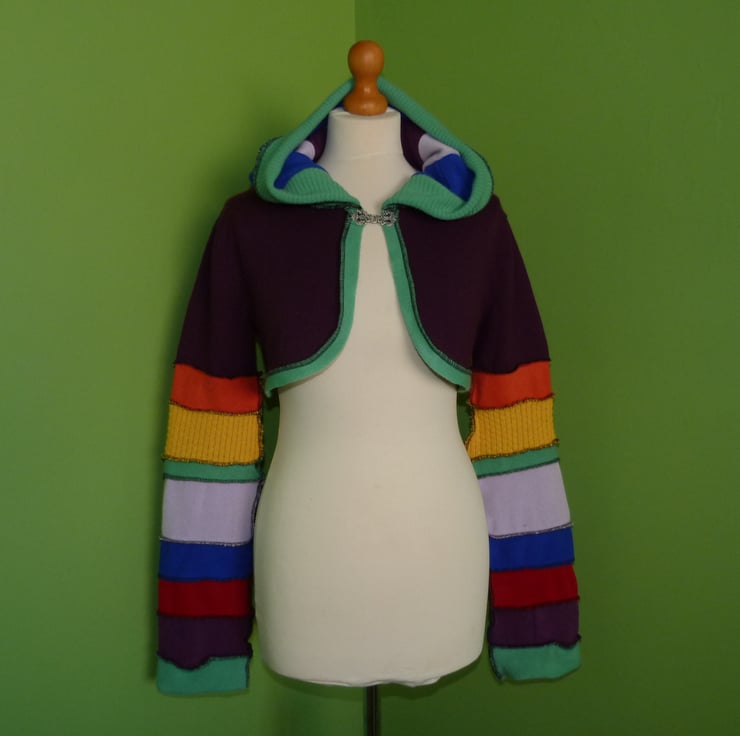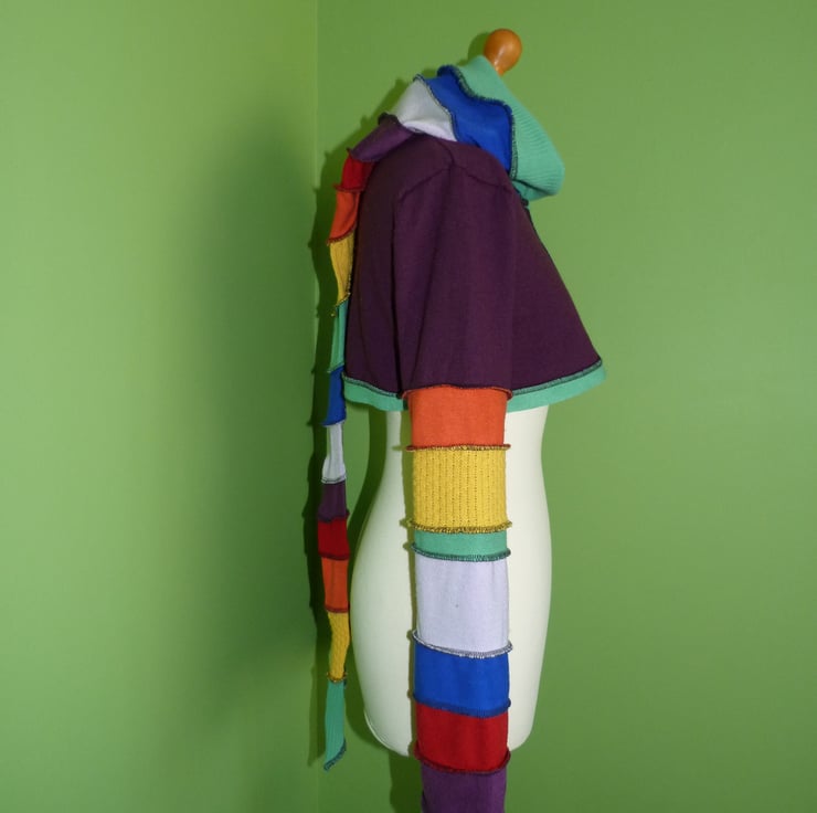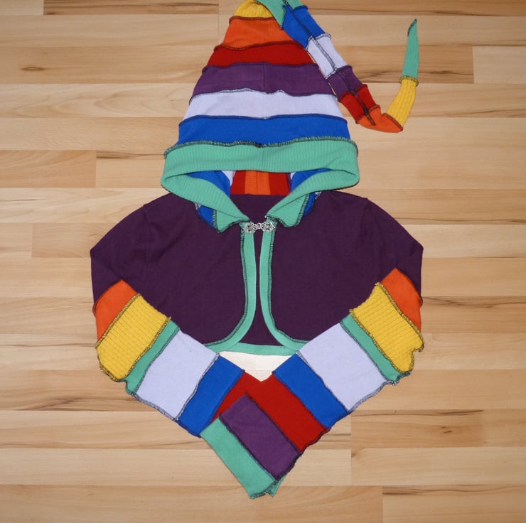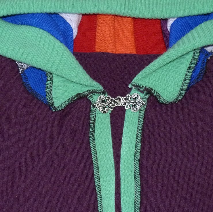 The jumpers are really soft and cosy, and have been carefully selected in the colours of the rainbow, on a purple bodice. There is a long hood, bell bottom sleeves with a thumb hole, and a decorative metal hook and clasp closure .