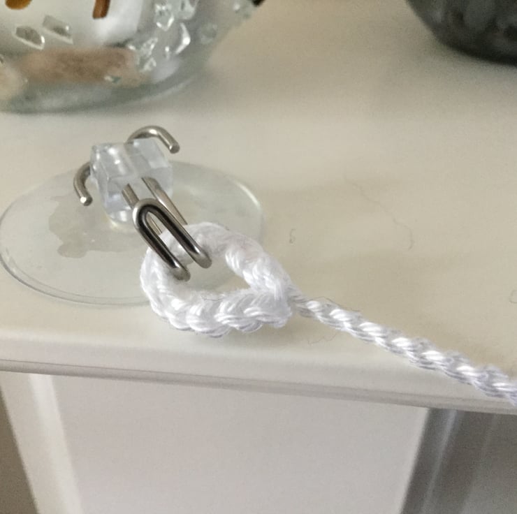 They are hanging from a white chain crocheted in cotton yarn with loops at each end for hanging.