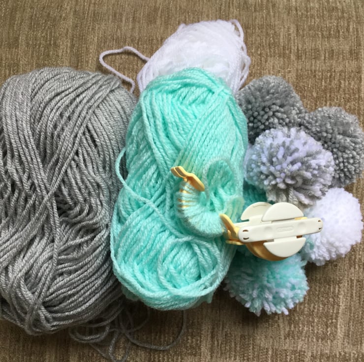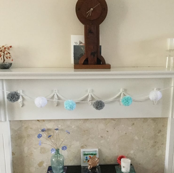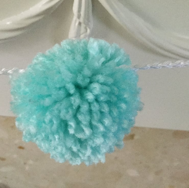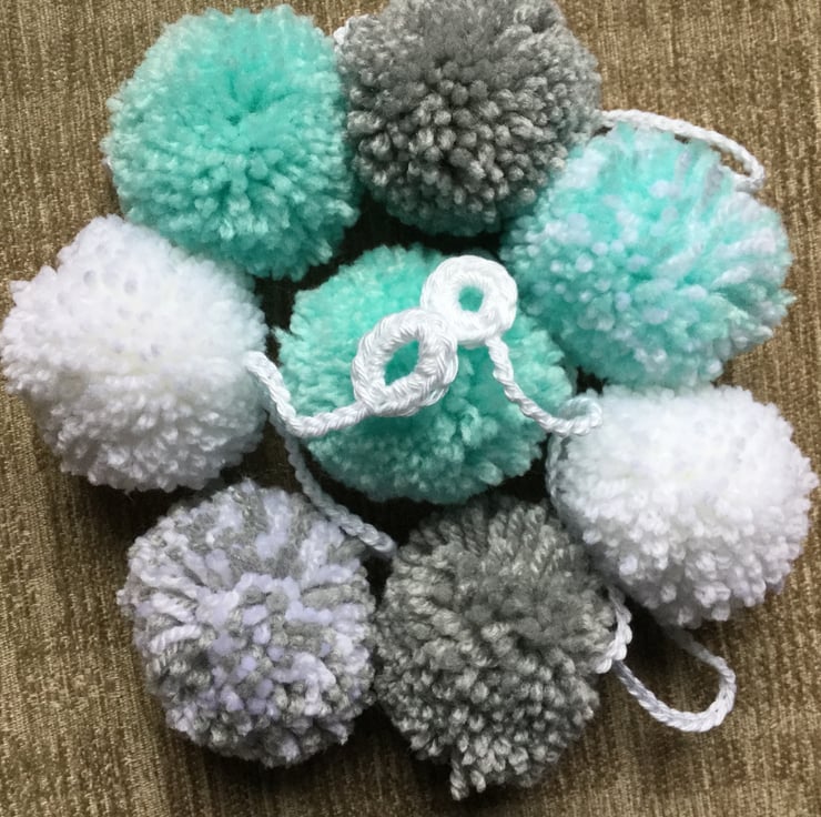 This lovely pompom garland has a total of 8 pompoms in mint, grey and white acrylic yarn.