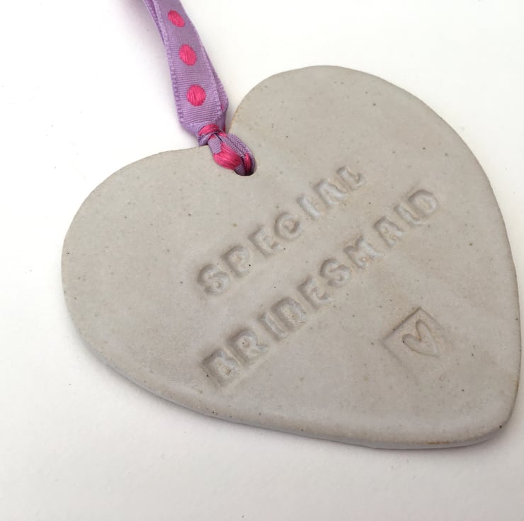 'Special Bridesmaid' pretty Loveheart hanger is perfect to hang around the home. It can be hung on a wall, around a beautiful plant, in the kitchen, office or in your car to brighten up your day. Handmade in Yorkshire