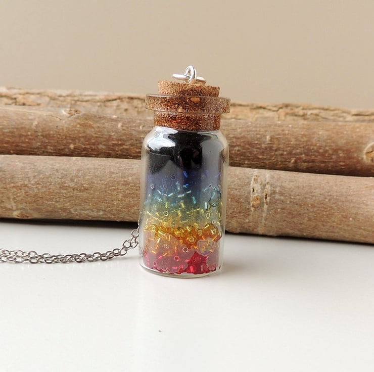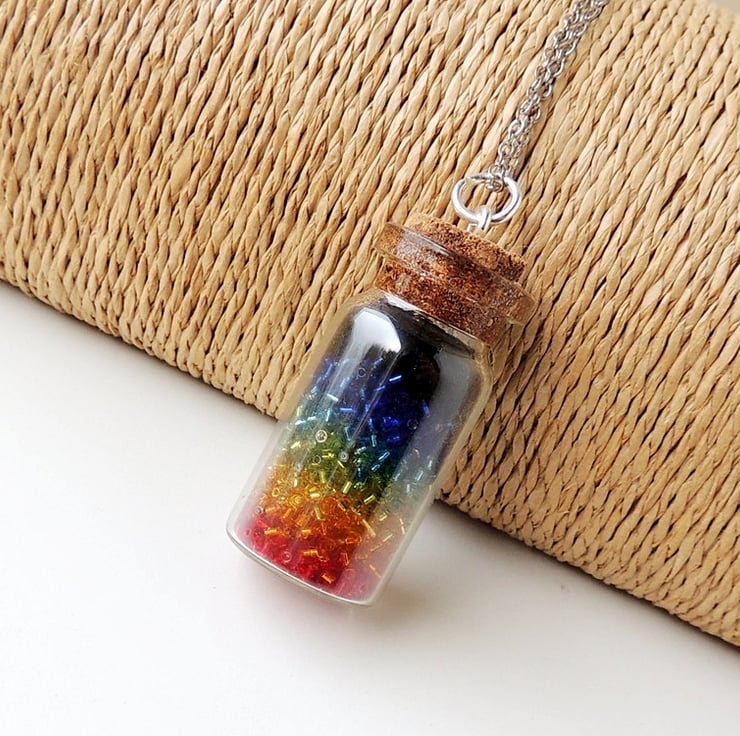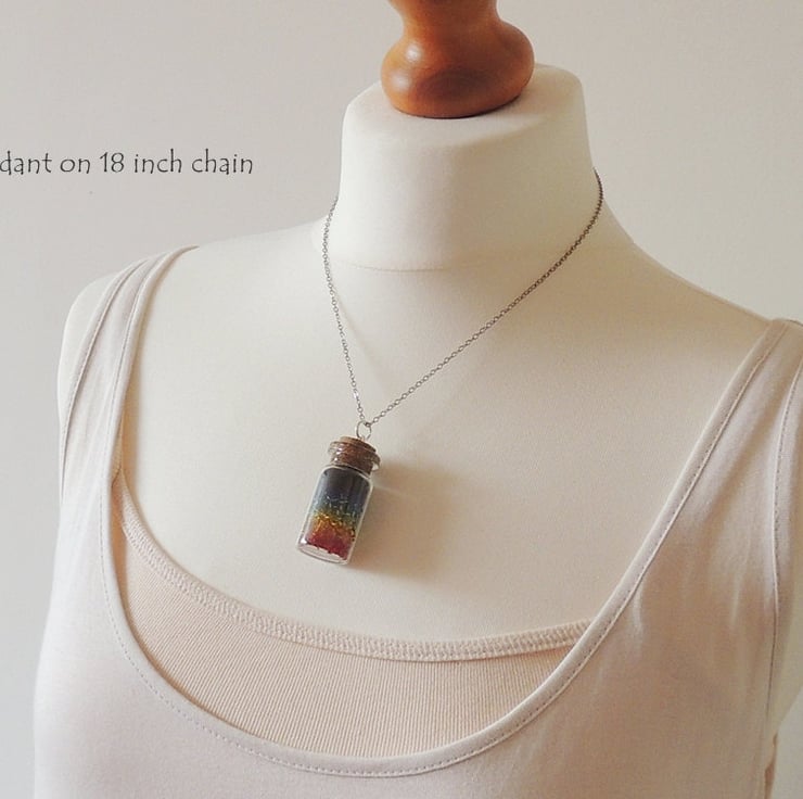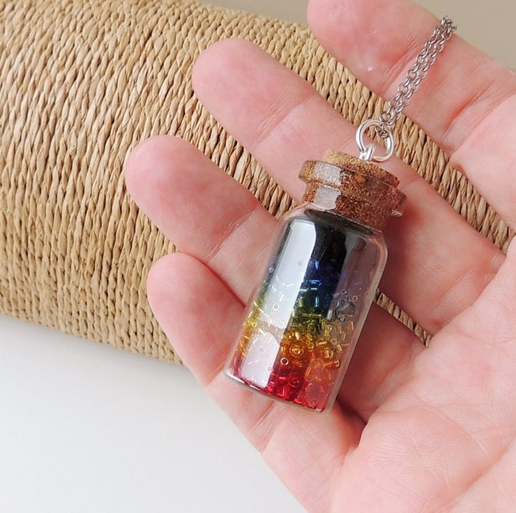 This necklace has lots of rainbow colour seed beads suspended in resin inside a glass bottle pendant.