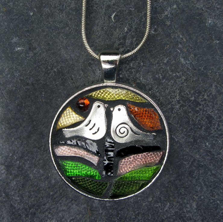 Unique hand made stained glass mosaic pendant. Full of light and sparkle featuring two little birds sat in a tree.