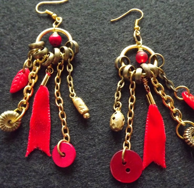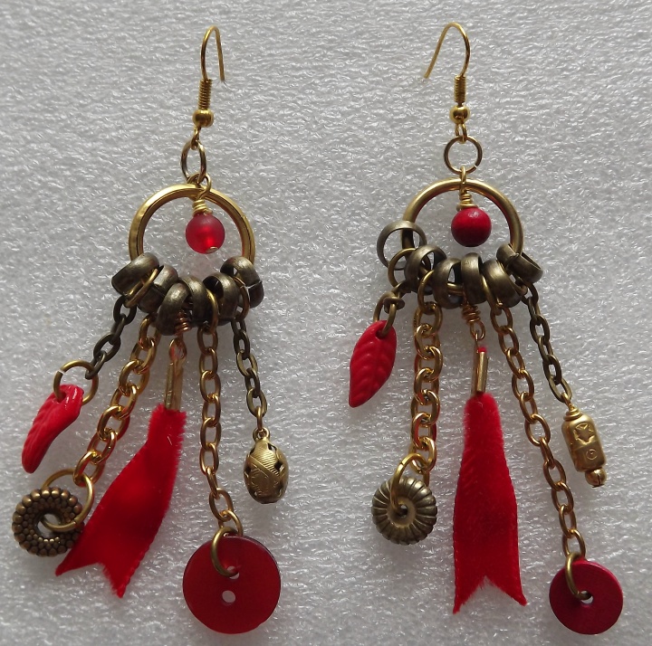 I have used brass eyelet rings from which I have suspended 5 dangles made with buttons, washers, fimo leaves, velvet ribbon and gold tone charms.