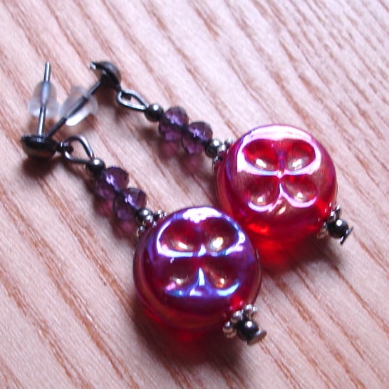These dinky earrings feature some lovely sparkly glass crystal beads and chic red lamp work glass beads. They are hung on black plated headpins and finished off with teeny tibetan silver beads. Really sweet! Lightweight and great for everyday wear.
