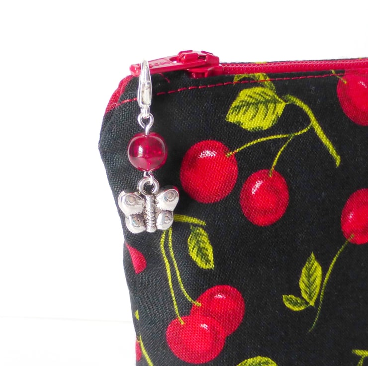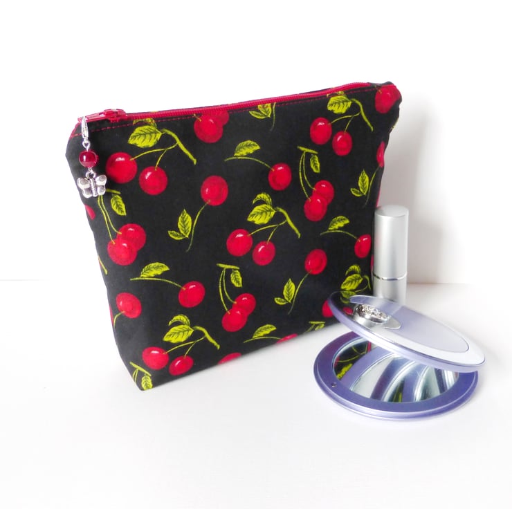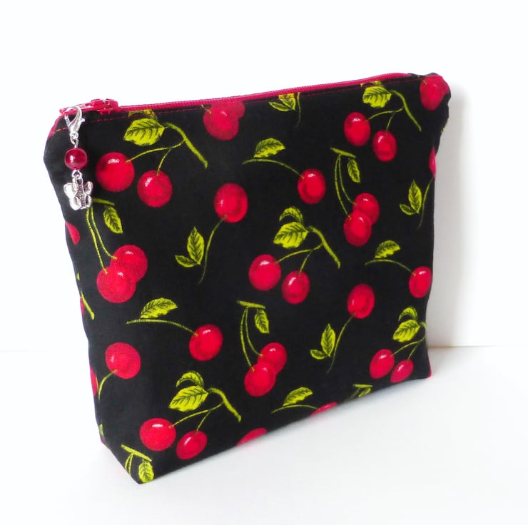 This is a medium sized make up/cosmetic bag, made of 100% cotton. It has a lovely red cherry design with green leaves on a black background.