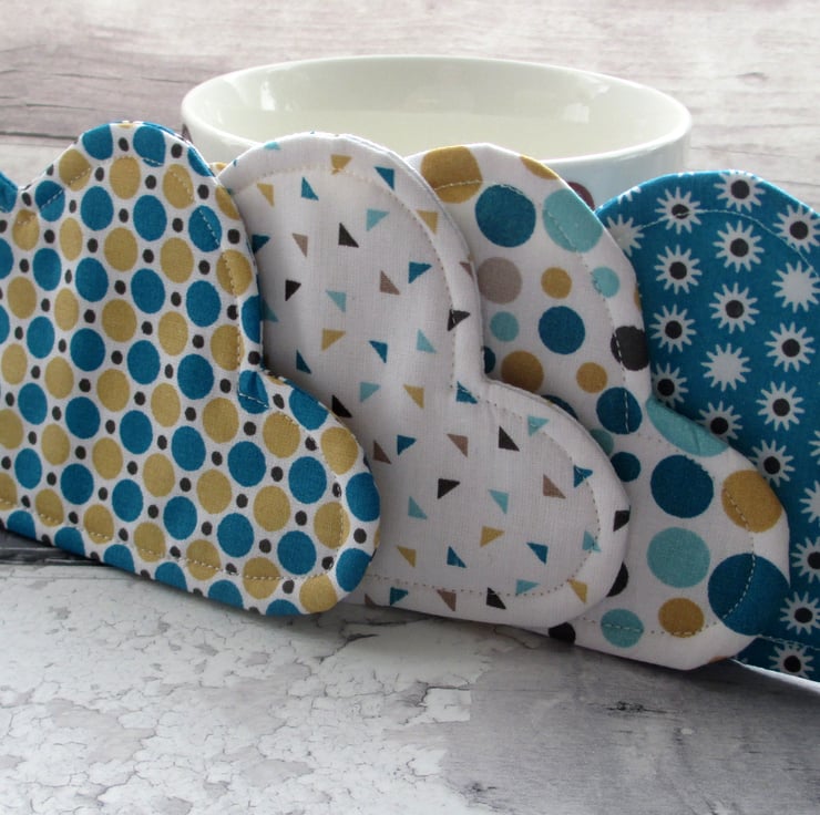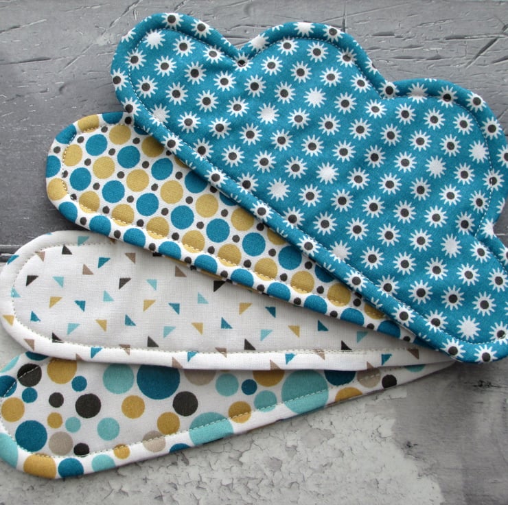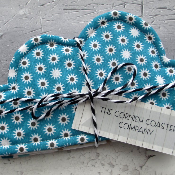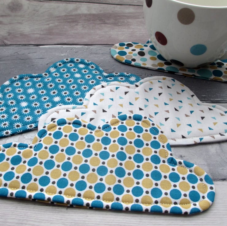 A set of 4 cloud coasters made with a bright and bold geometric design fabric in blues, mustard & white.