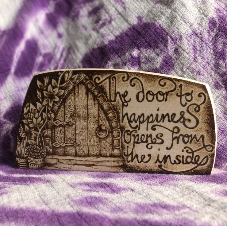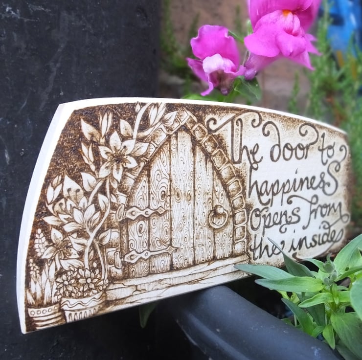 The design is a fairy door, adorned with flowers, and the words: