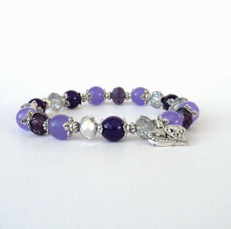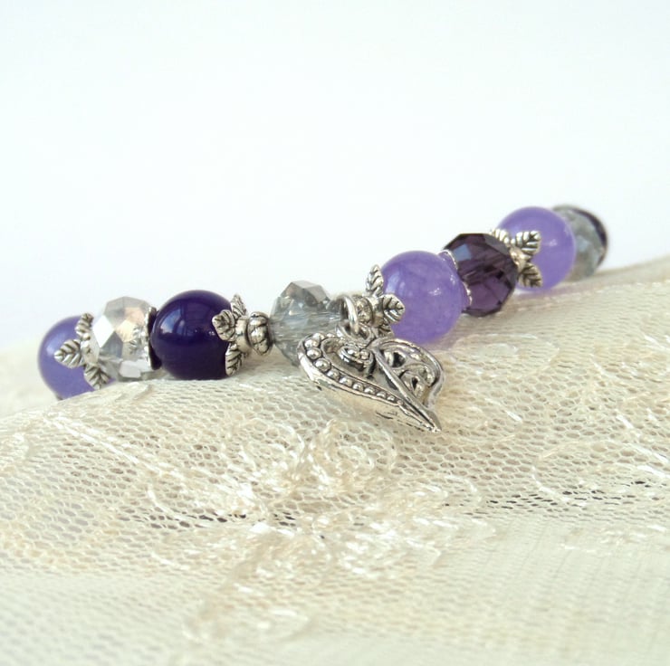 This gemstone bracelet is made with a mix of colours and stones - purple / lavender alexandrite and jade, silver & purple crystal and tibetan silver beads.