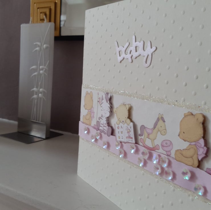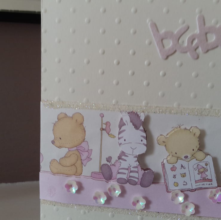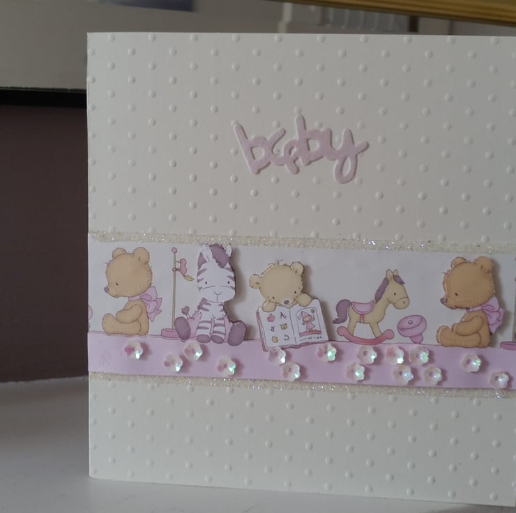 A. Completely handmade And uniquely designed card. Consisting of quLity cream card which has a decoupage strip across the centre. A row of baby toys Zebra, very bears. Surrounded by two layers of dirty embossed cream card with fine glitter edging. Finished off with prettyrosesequins and Baby die cut from pale pink pearl card