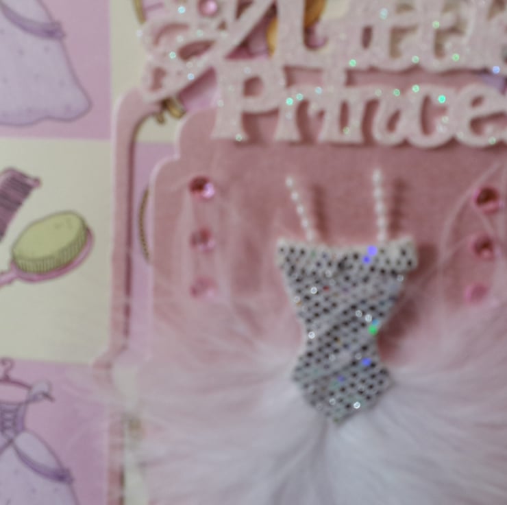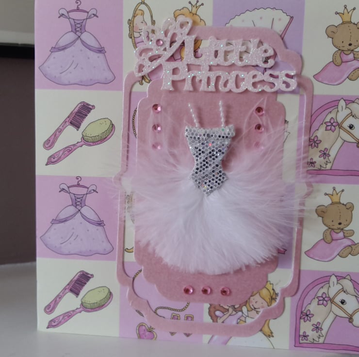 A completely handmade and uniquely designed card. Consisting of glamorous dress made using sequins and feathers mounted onto pale pink pearl card, then onto girly patterned paper and then onto the cream card. Finished off with little princess die cut from pink glitter card and pink sparkly gems