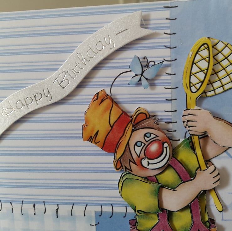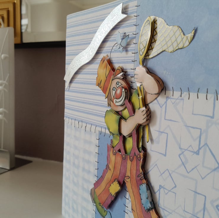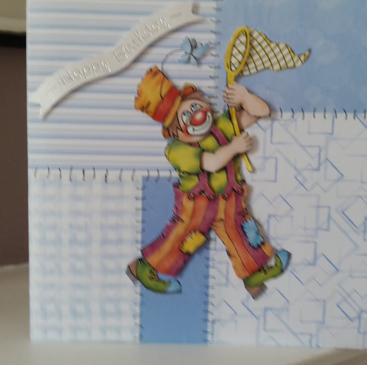 completely handmade and uniquely designed card. Consisting of a decoupaged clown mounted onto co ordinating pale blue papers joined with hand drawn stitches. Finished off with happy birthday tag