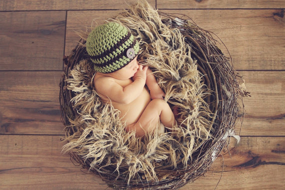 Made in acrylic in a lovely shade called Moss Green with brown contrast bands. Finished off with a brown wooden button.