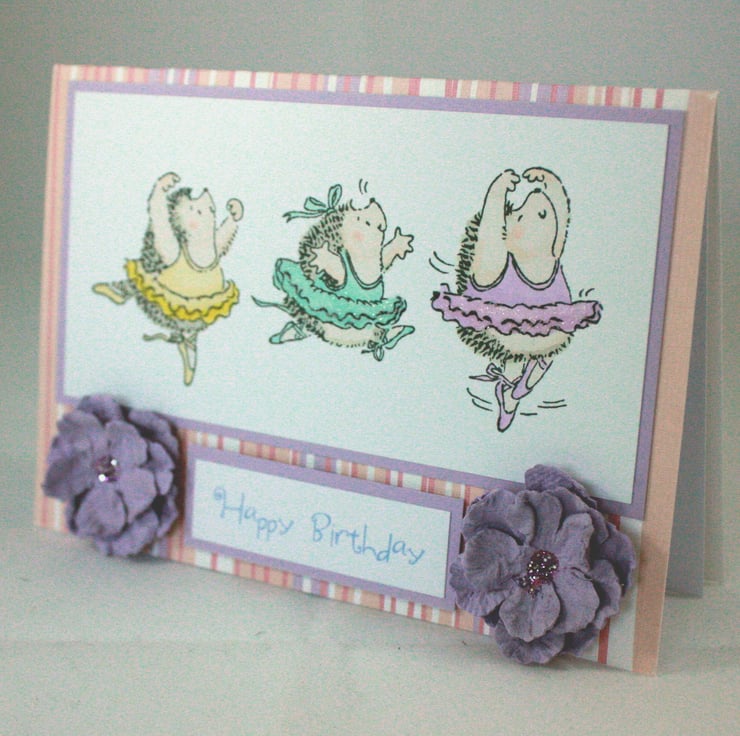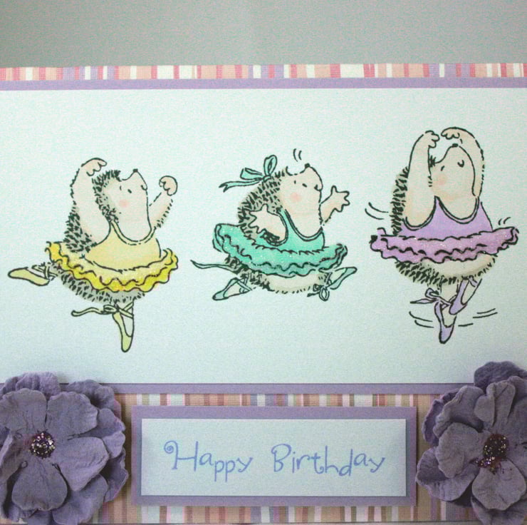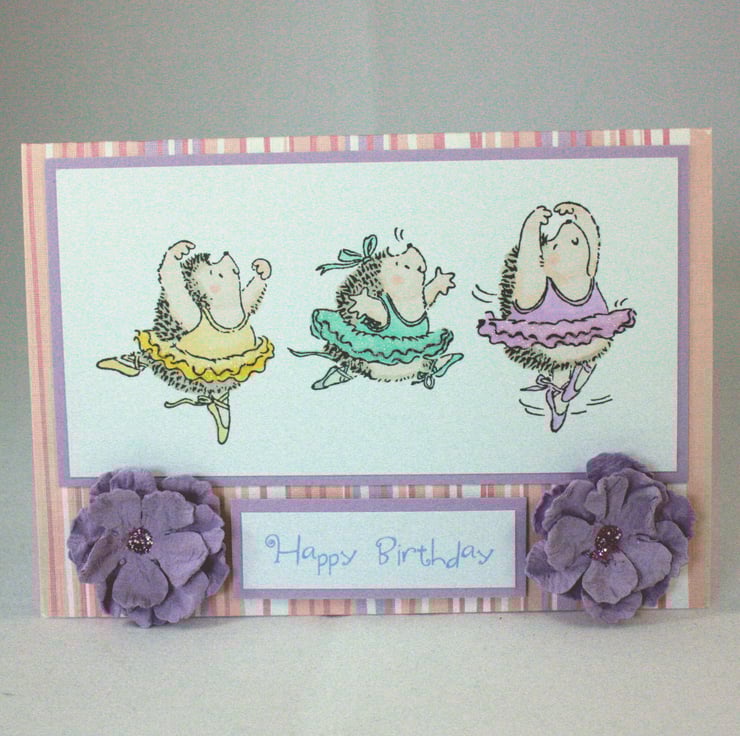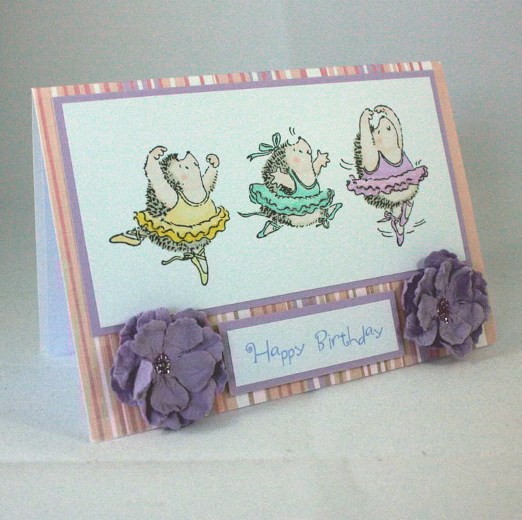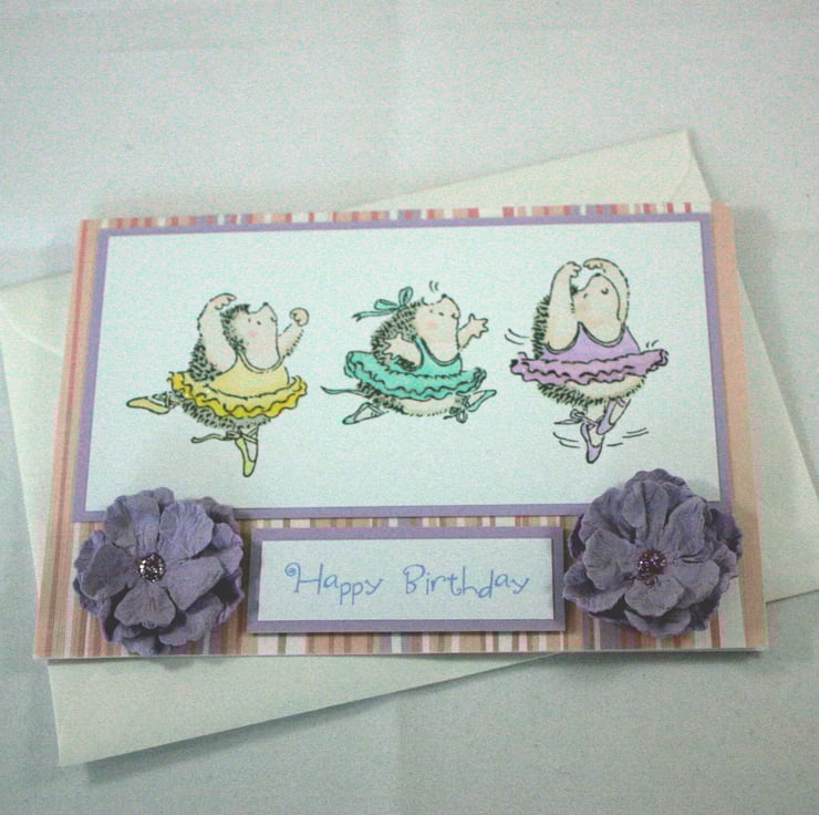 A6, landscape orientated birthday card. The base card is pink, white and lilac striped with a lilac reverse. The image of ballet dancing hedgehogs has been hand stamped and coloured and glitter glue applied to the tutus. The card is finished with two lilac paper flowers and the printed message 'Happy Birthday'.