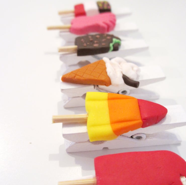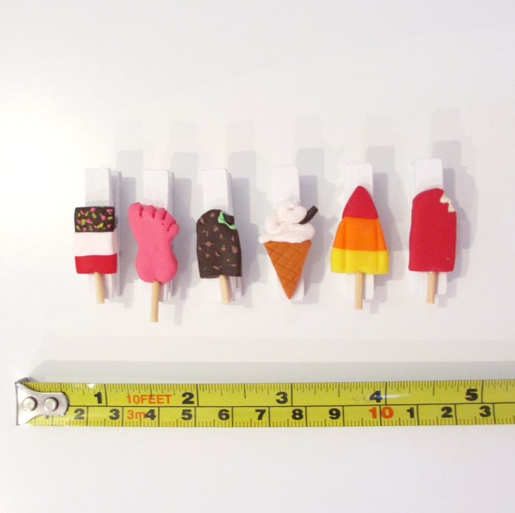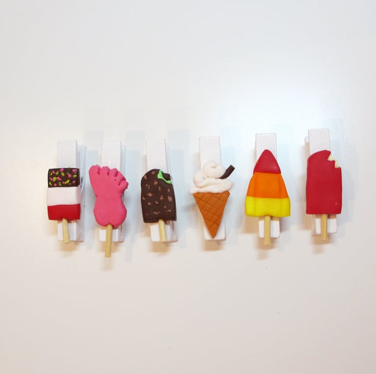 A set of six white mini pegs each with a retro ice lolly / ice cream attached to make them even more special and unique! Use them for your diary planning, to collect notes together, or even to pin up photos in your home!