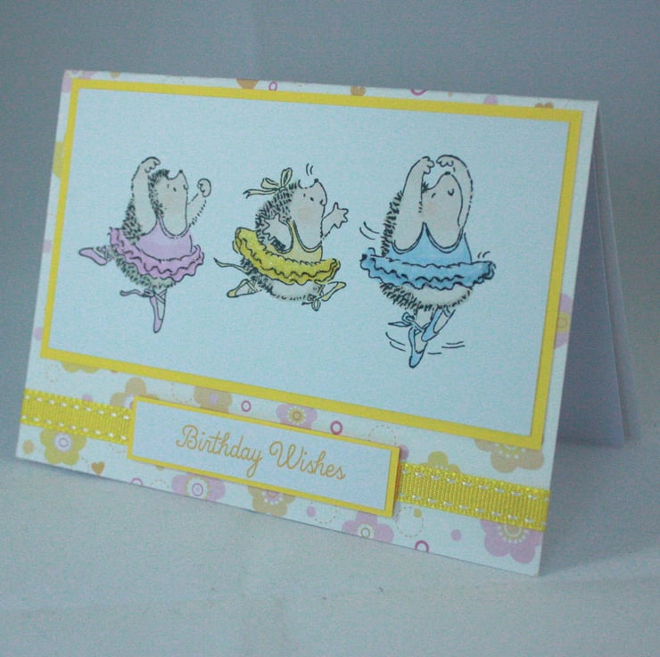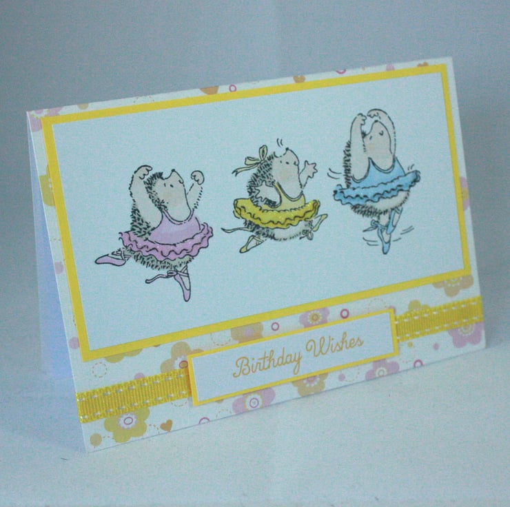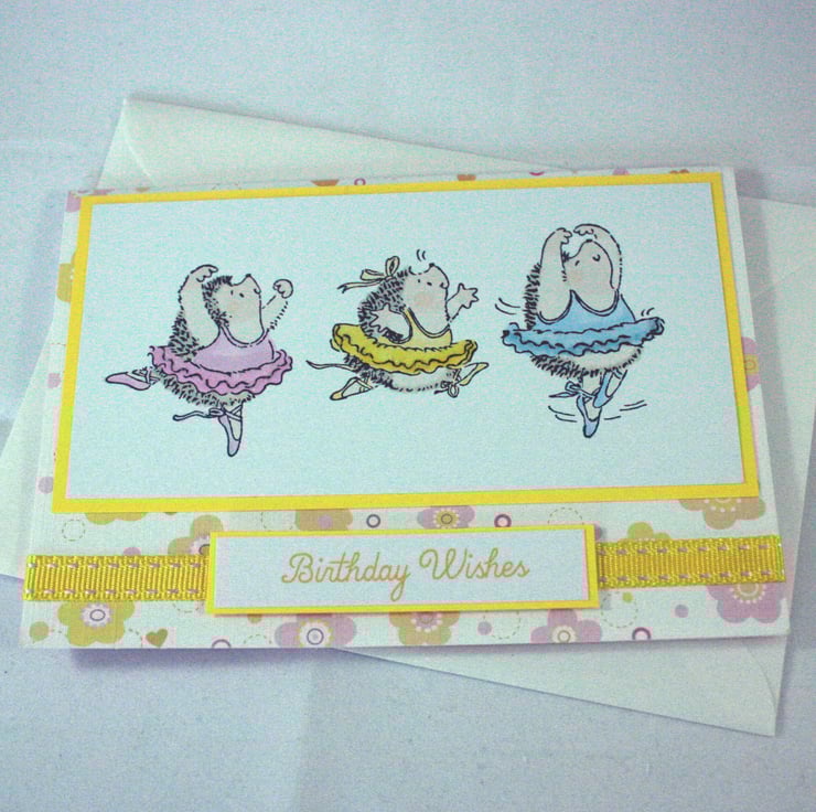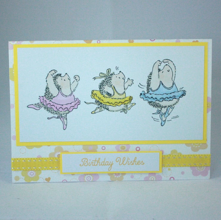 Floral, A6 birthday card featuring a stamped image. The image of three ballet dancing hedgehogs has been hand stamped and coloured and the tutus have been glittered. The message 'Birthday Wishes' has been printed in yellow ink and overlaid on a yellow stitched ribbon.