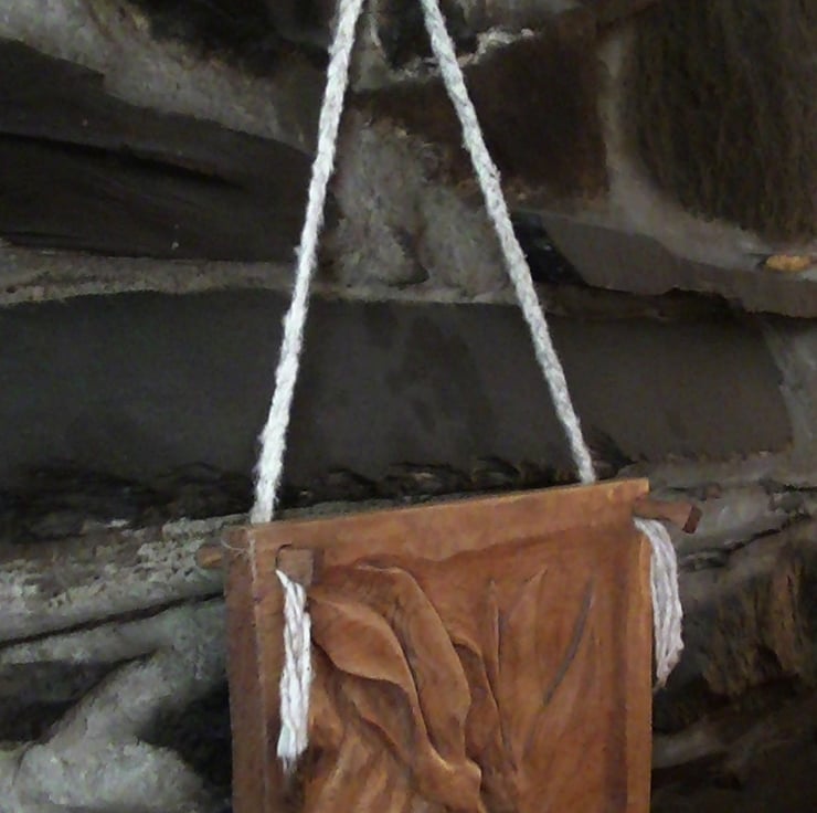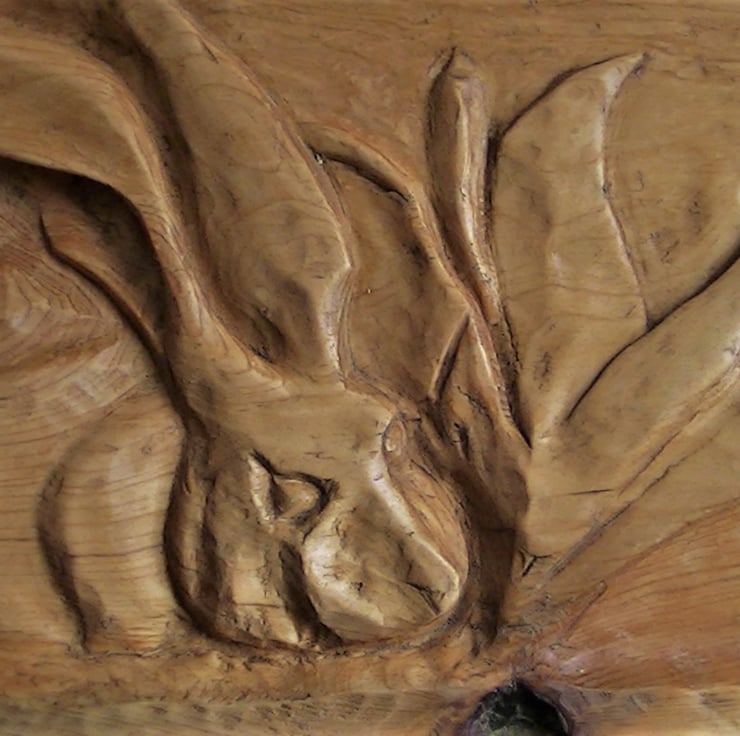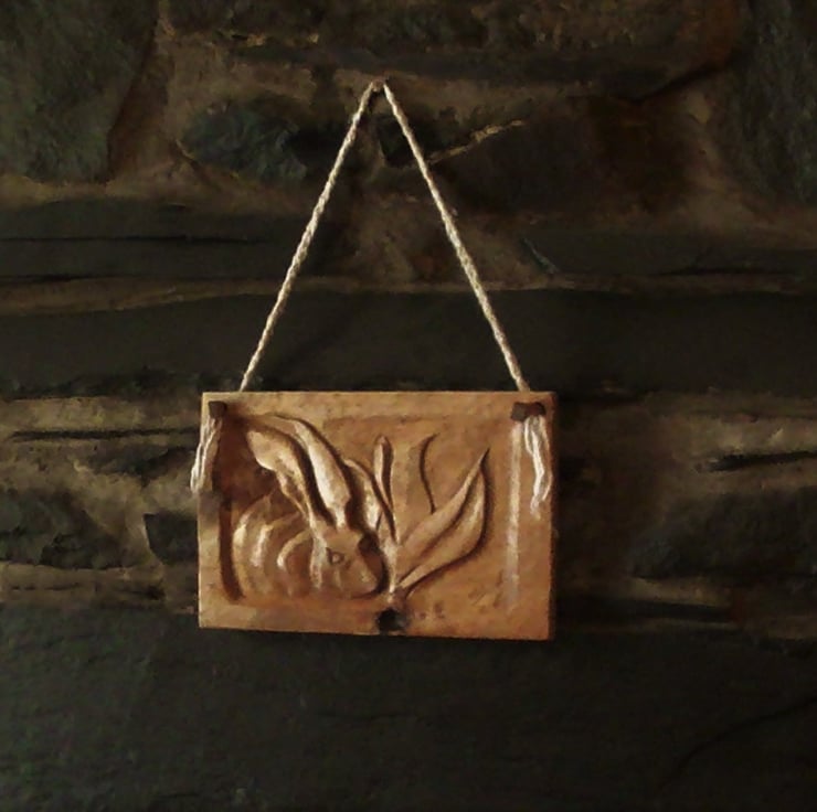This carving is made on a piece cedar wood and is a hare snoozing in the undergrowth.