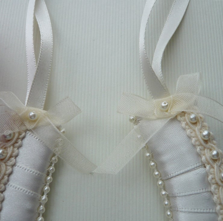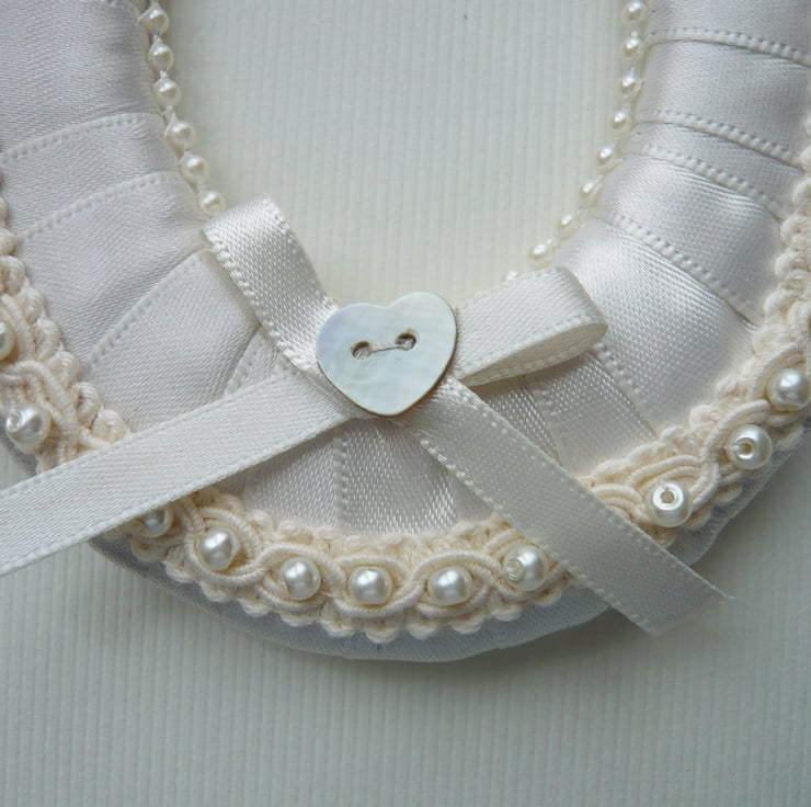 I have added a cotton lace trim and seed beads as decoration and then in the centre a bow and a mother of pearl heart shaped button