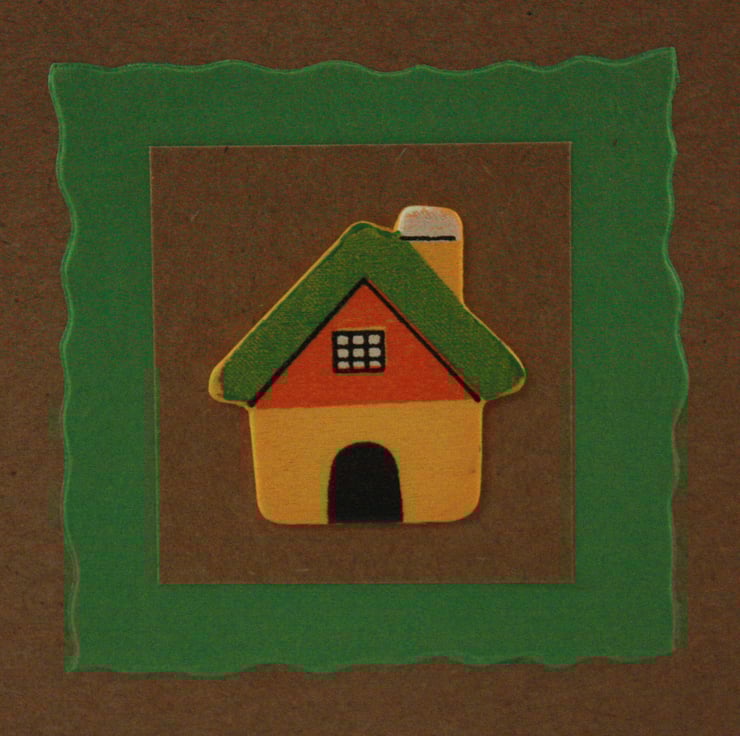 New home card, featuring a small wooden house topper on a square kraft card blank. The topper has been layered over a square of kraft card and green deckle edged card.