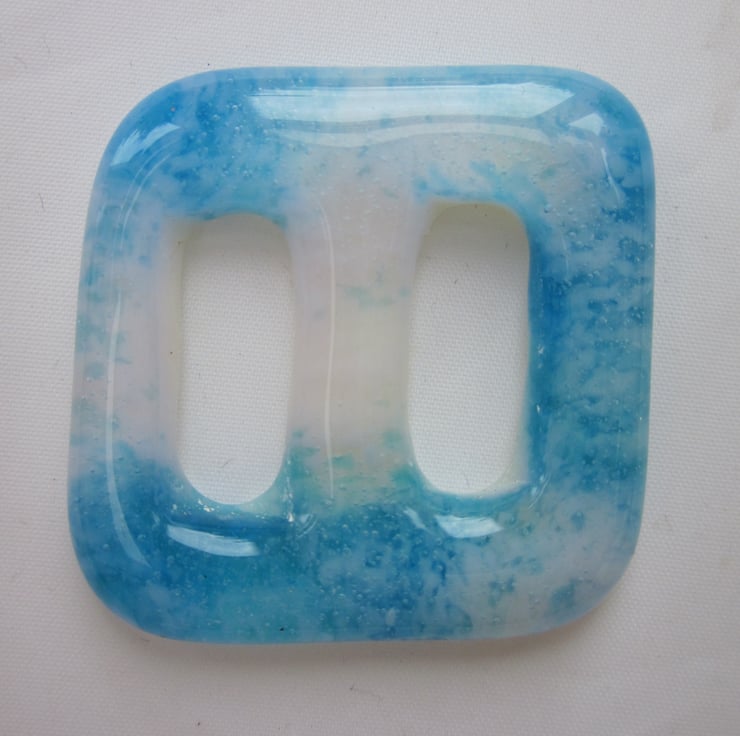 This glass buckle was fused by me. It was cast in a mould and then the glass was heated up to around 780 degrees celsius in a small glass fusing kiln and then it was then brought to annealing temperature to make it strong. It was then fire polished in the kiln to create the smooth surface. This whole process takes over 17 hours to complete.