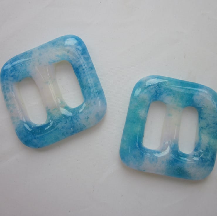 These buckles are made from transparent turquoise and opaque pale pink and ivory frit and are pleasantly wonky. They are approximately 3.5cm across. They will be perfect to fasten a bag or belt or to use as buttons.
