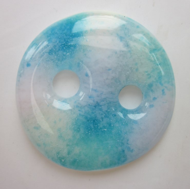 Each button is handmade and there will be some irregularities in shape due to this - do not expect perfectly matched holes! Frit casting is done by combining tiny pieces of glass, including clear, within a casting mould. This means that there may be variations of colour depth within the piece and this is normal.