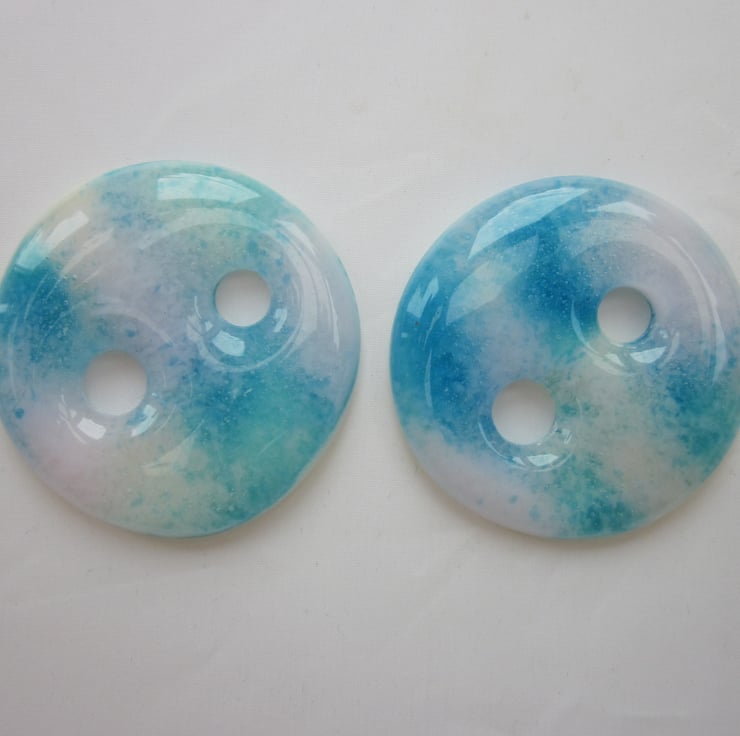 These buttons are made from transparent turquoise and opaque pale pink and ivory frit and are pleasantly wonky. They are approximately 3.5cm across. They will be perfect to fasten a bag or cardigan.