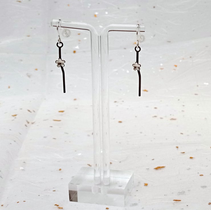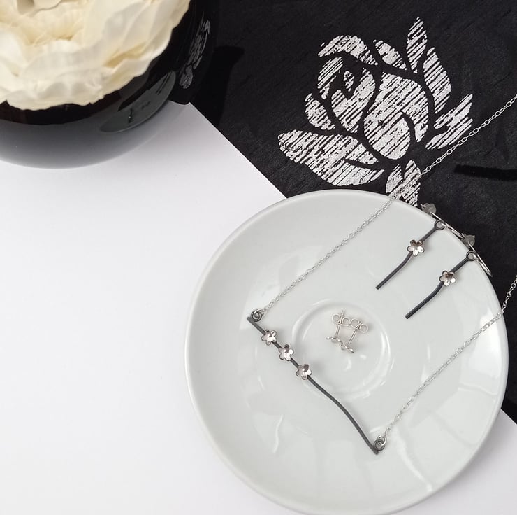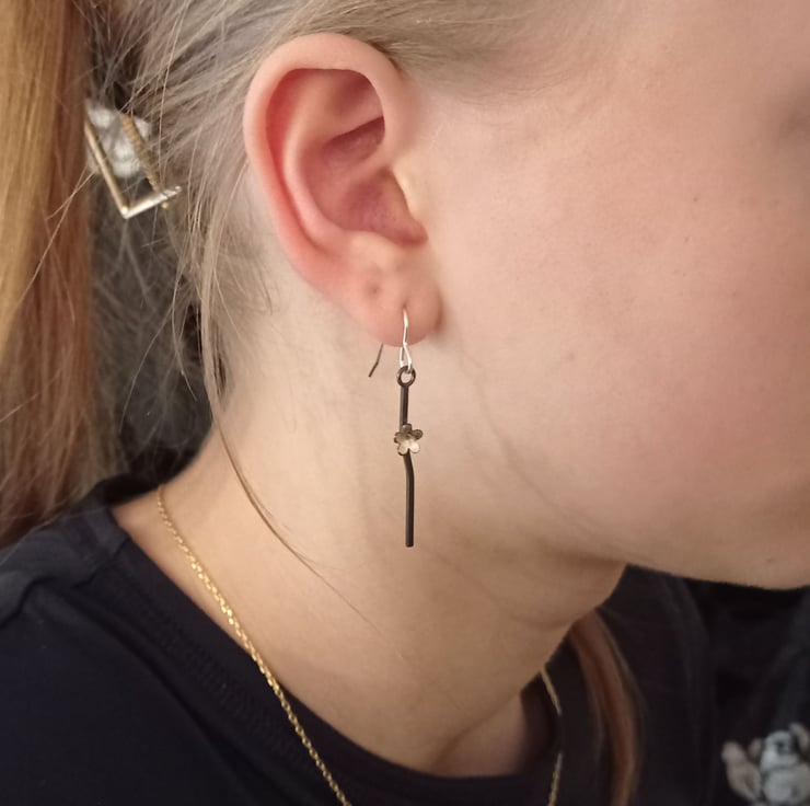 I was inspired to design a collection based on the blossom in my garden. The design process took me to making little silver flowers and setting them on silver square wire; these silver and black earrings were one of the final pieces.
