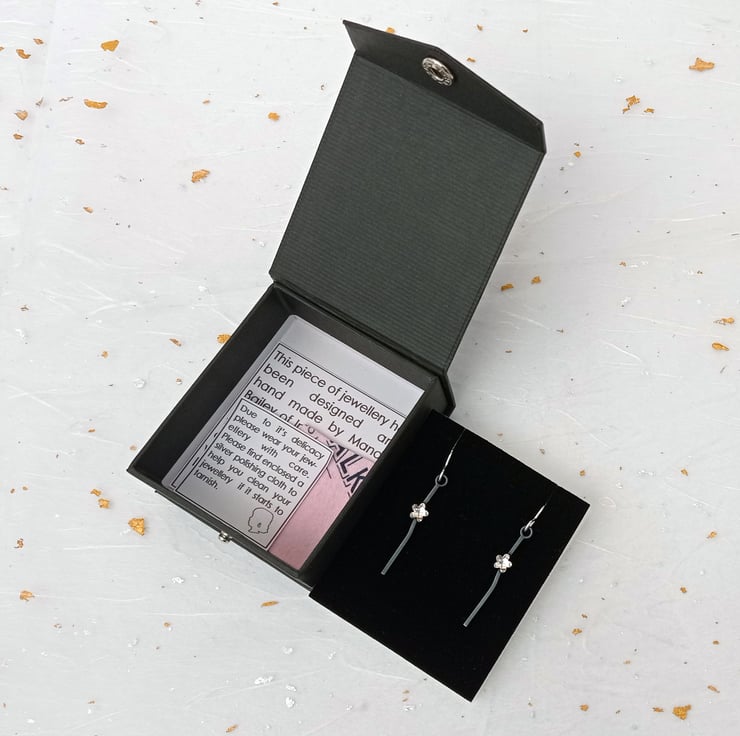 The earrings will arrive in a black jewellery box, complete with simple care instructions and a small square of silver polish.