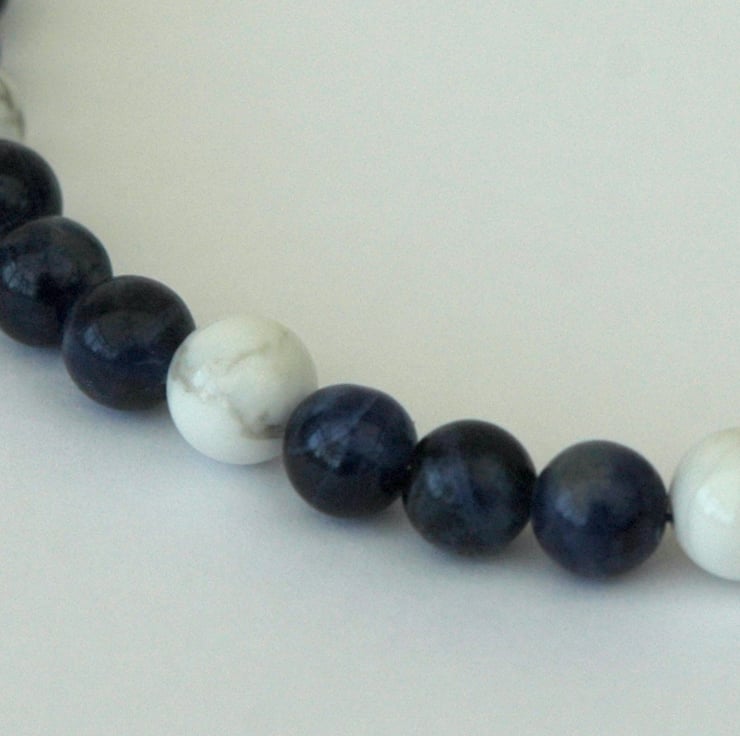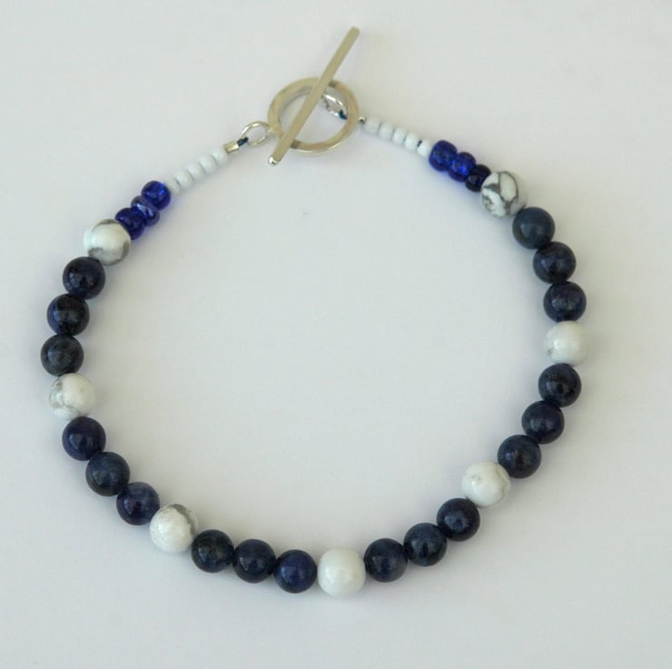 This pretty bracelet features semi-precious beads of white howlite and blue sodalite, fastened by a simple sterling silver toggle clasp hand made by me. Navy and white is a classic combination that adds a touch of sophistication to any outfit. It looks great with a white shirt and denim jeans. The beads are strung on dark blue beading wire and the strand is finished off with three dark blue glass rondelles and half a dozen white seed beads at each end. The length of the bracelet is 8inches (20cm) and the gemstone beads are 6-7mm in diameter. It will fit a medium wrist.