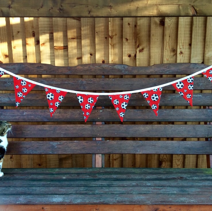 Football Bunting, handmade using a red football print fabric. Perfect for a Birthday party, playroom, boys room, Man cave, garden decor and for celebrating team wins