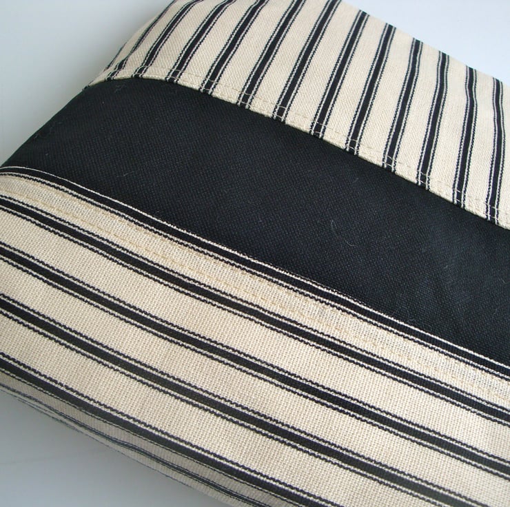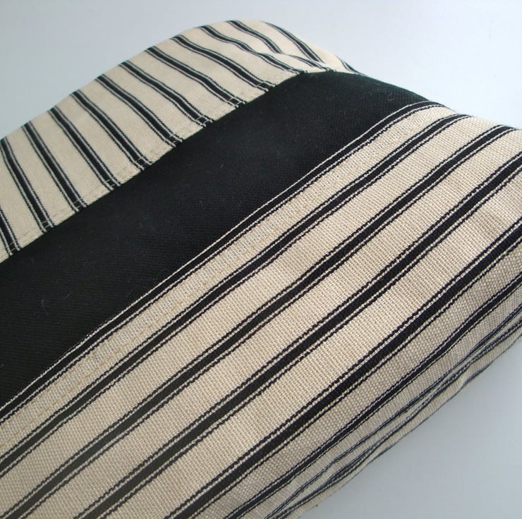 Bag has been handmade in a black/ natural stripy cotton canvas , with a black cotton canvas panel on the front . ( interfaced )