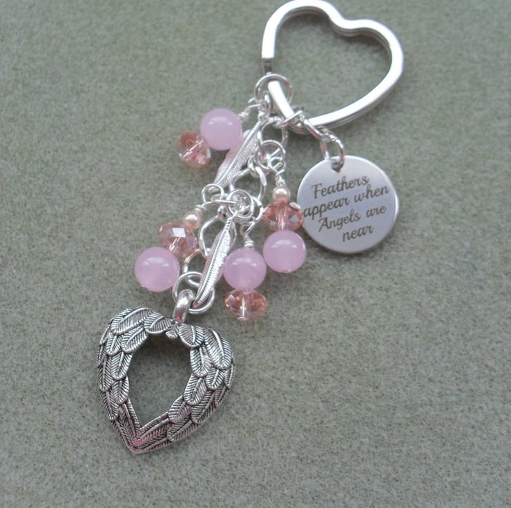 Keyring with a large heart shaped charm with feather detail, 2 feather charms and a round Charm with FEATHERS APPEAR WHEN ANGELS ARE NEAR written on are attached to a strong heart shaped split ring. With crystal beads which add a little sparkle and pink quartzite semi precious gemstones