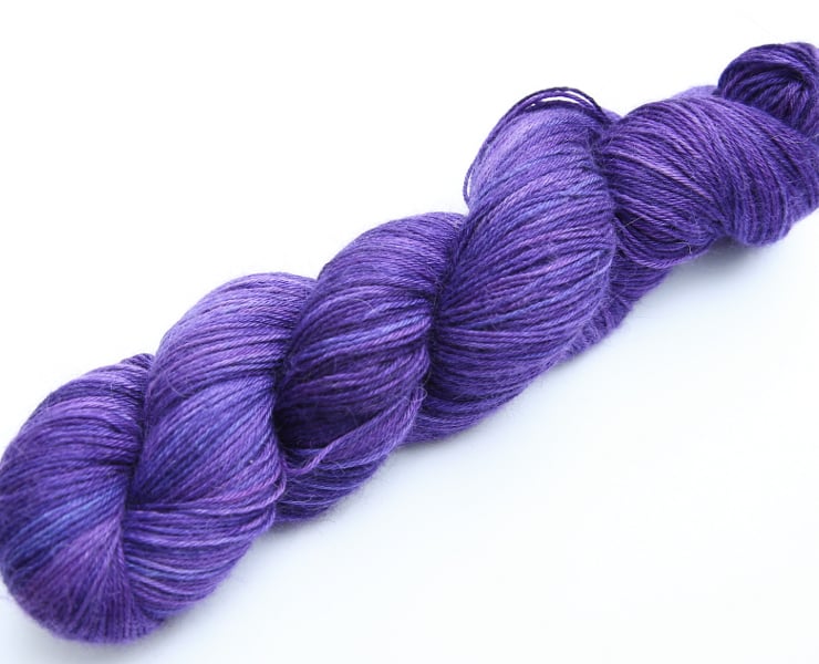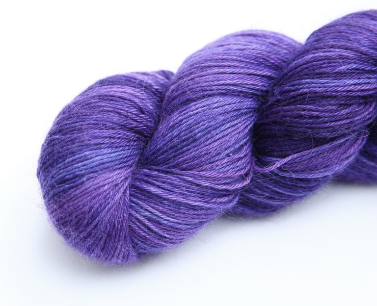 Semi-solid/subtley variegated violets. This gorgeous and luxurious yarn has the softness and warmth of alpaca with the smooth sheen and cool feel of silk. This is the 4-ply/sock weight equivalent of the my bestselling silky baby alpaca laceweight, and combines the softness and luxury of the baby alpaca/silk blend with the versatility of 'sock' yarn. Photographs have been taken and edited in bright natural light.