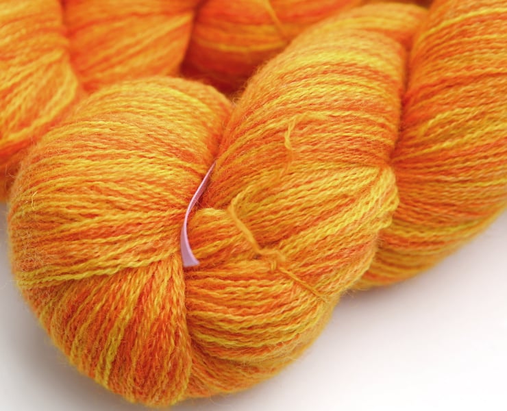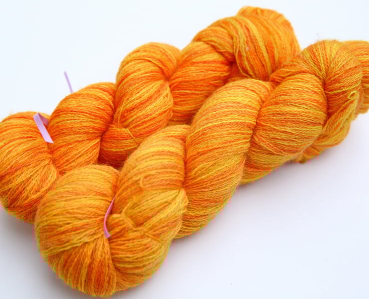 Bright sunshine oranges and yellows. This lustrous, lofty, soft yarn should make beautiful lace projects. There is one skein left. Photographs have been taken and edited in bright natural light.