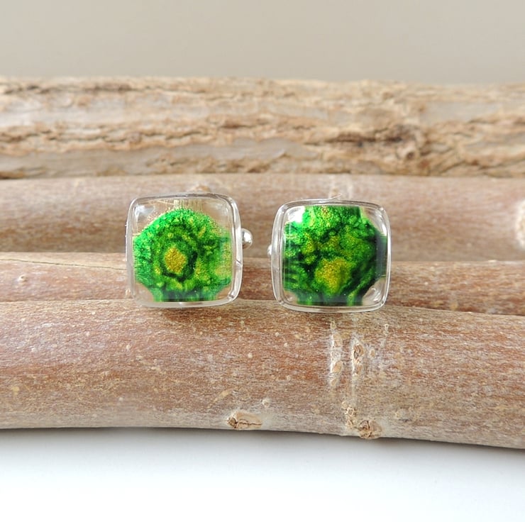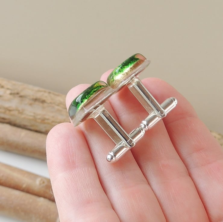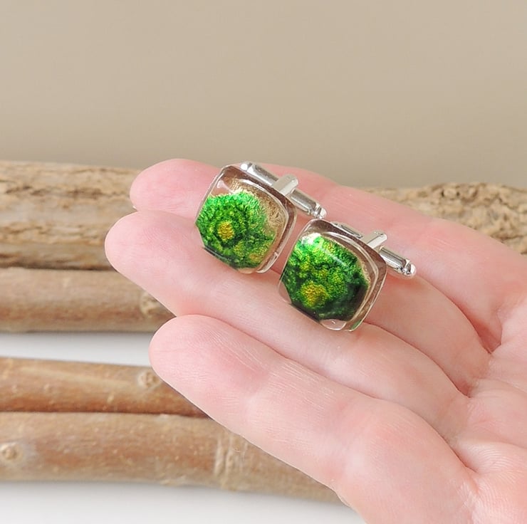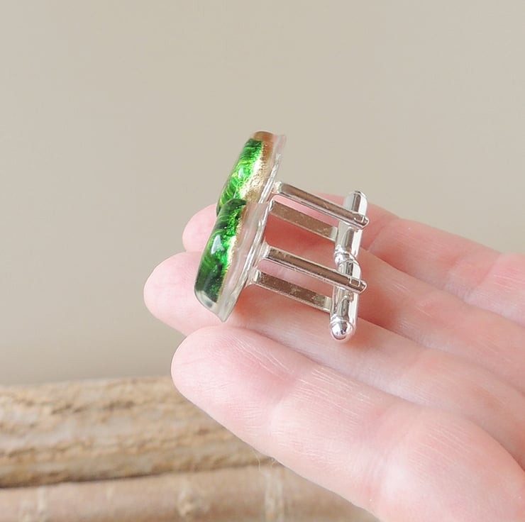I made them with small round green and gold resin cabochons that I have cast inside larger clear resin cabochons. The base of the cufflink fittings are embedded in the resin for additional security.