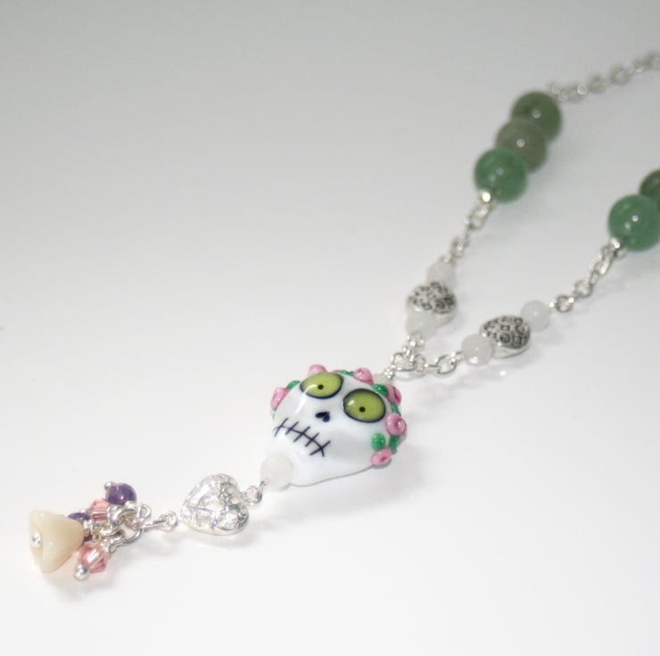 A beautiful lampwork glass sugar skull made by Samantha Capeling is the focal of this necklace. Suspended under the skull is a silver plated filigree heart and Czech glass bicones in purple and pink and a chalk white glass flower. The chain is embellished with faceted white quartz, decorated Tibetan silver beads and green aventurine gemstones.