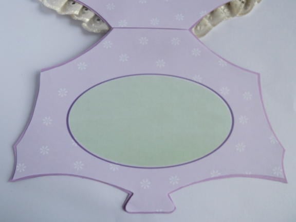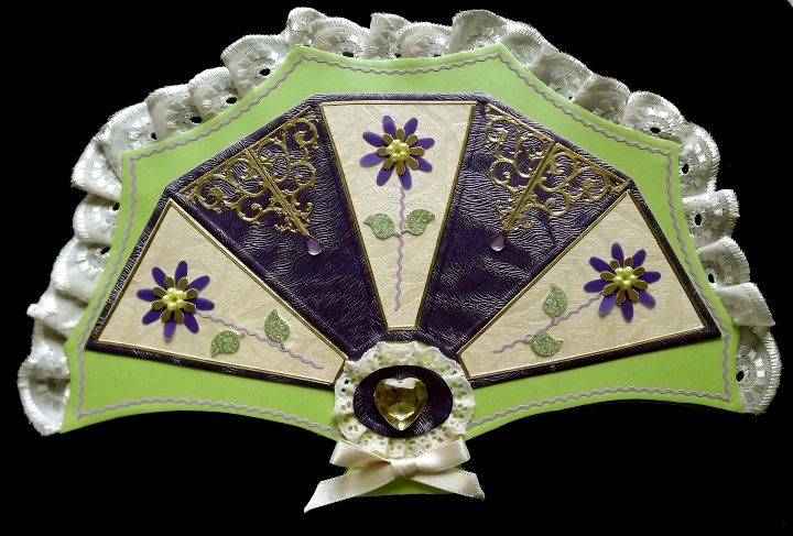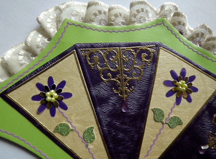A floral fan shaped blank/birthday card which I have decorated with textured papers, vellum flowers, fancy gold peel off motifs, gems, ribbon and lace.
