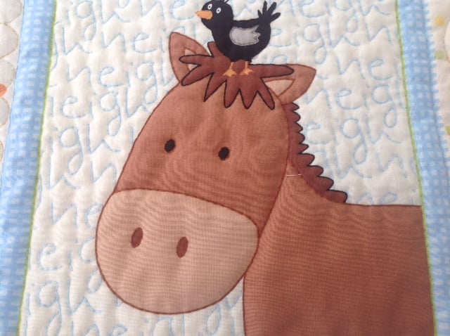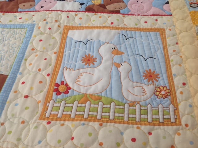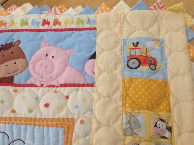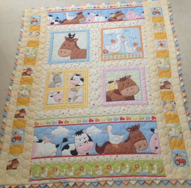 This is a really pretty farmyard themed quilt, it is a printed panel that I have hand quilted all around the animals and in between, it is backed with soft white cotton and finished off with a prairie point edge.