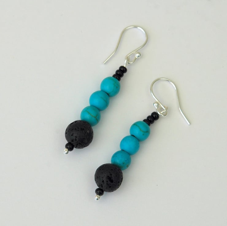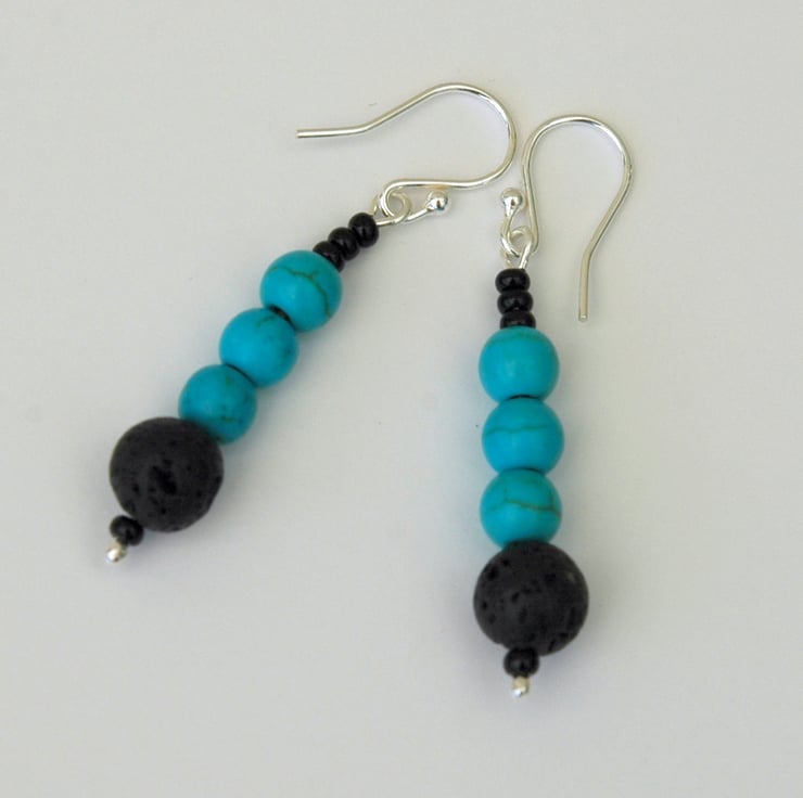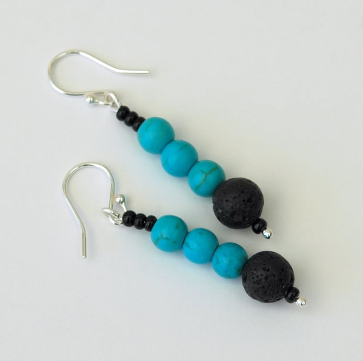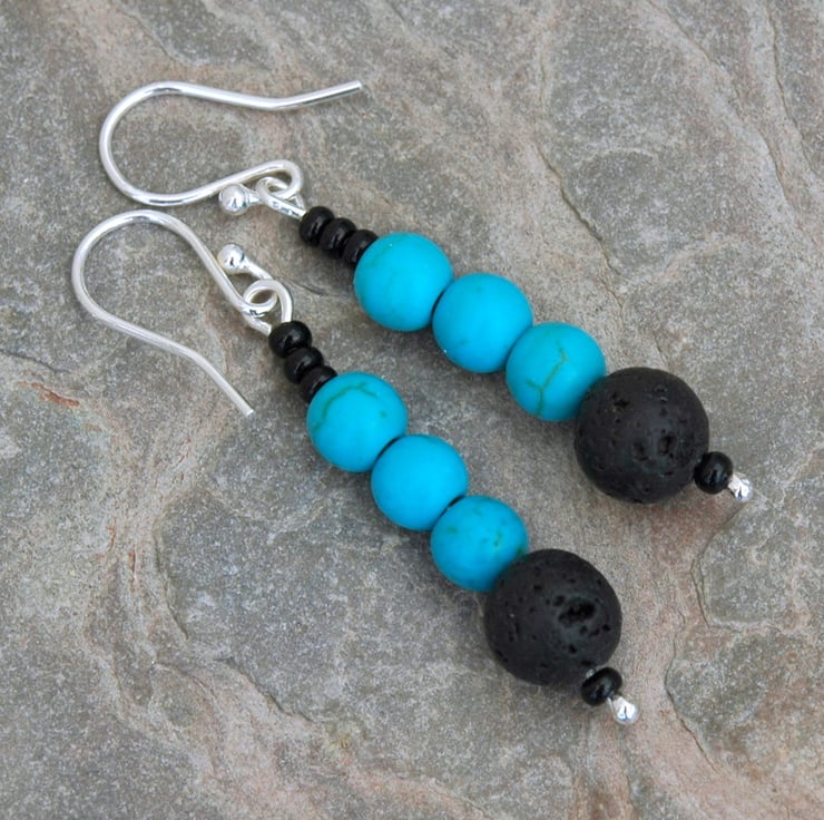 These gorgeous dangly drop earrings feature round beads of black lava rock and synthetic turquoise, mounted on hand made sterling silver head pins and dangling from elegant silver ear hooks stamped 925 for sterling. The bold colours really zing. The black lava rock beads are rough and porous, as they were formed during a volcanic eruption from frothy gas-filled lava. This makes them very light to wear and gives them an interesting craggy matt finish. The length of the earrings is 3.7cm or 11/2 inches - this is the drop below the hook. The beads are 8mm and 6mm in diameter. A few black seed beads have been added at each end. A matching necklace and earrings are available as separate listings - see last photo. You can buy the three together from the Jewellery Sets section of my Folksy shop with a discount of £8 compared to the separate listings.