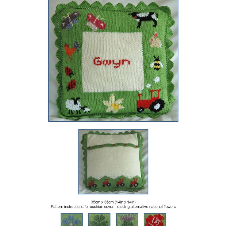 This is an 8 page knitting PATTERN for a 35cm x 35cm (14ins x 14ins) cushion cover. The pattern is written as colour charts and written instructions in standard UK knitting terminology. The cushion cover is knitted in separate pieces: front, back, upper back flap and edging then sewn together. There is a blank chart provided for you to plot a personalisation to use on the front. The national flower of Wales, the daffodil, features on the front chart. Substitute charts are provided for the national flowers of England, Scotland, Northern Ireland and the Republic of Ireland.