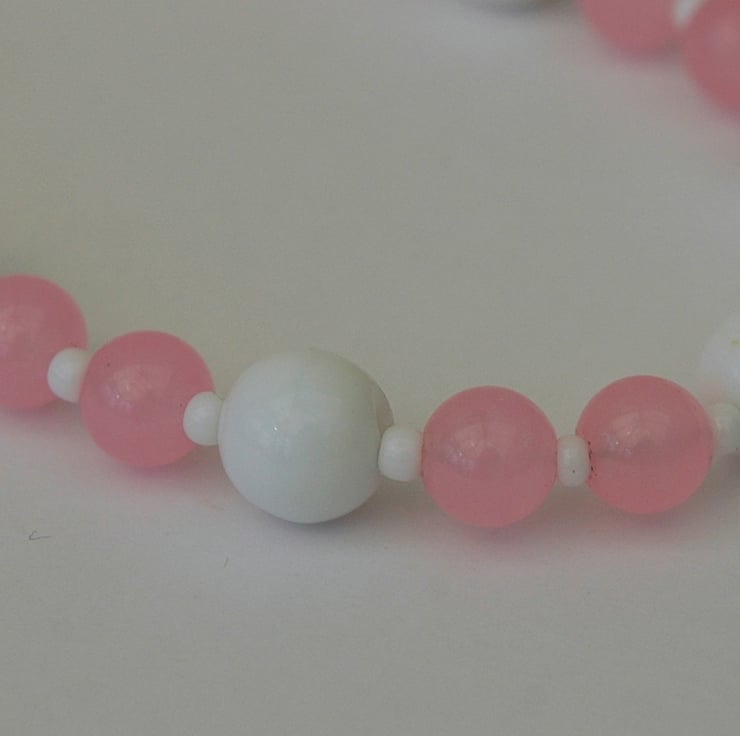 This pretty feminine necklace features pink rose quartz gemstone beads teamed with white glass beads and small white seed beads. The S-shaped clasp and ring have been hand made by me from sterling silver. The necklace is 191/2inches (49cm) in length. The Rose Quartz beads are 6mm in diameter and the white beads 8mm, mounted on silver coloured beading wire.