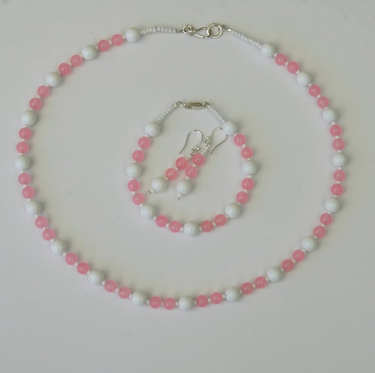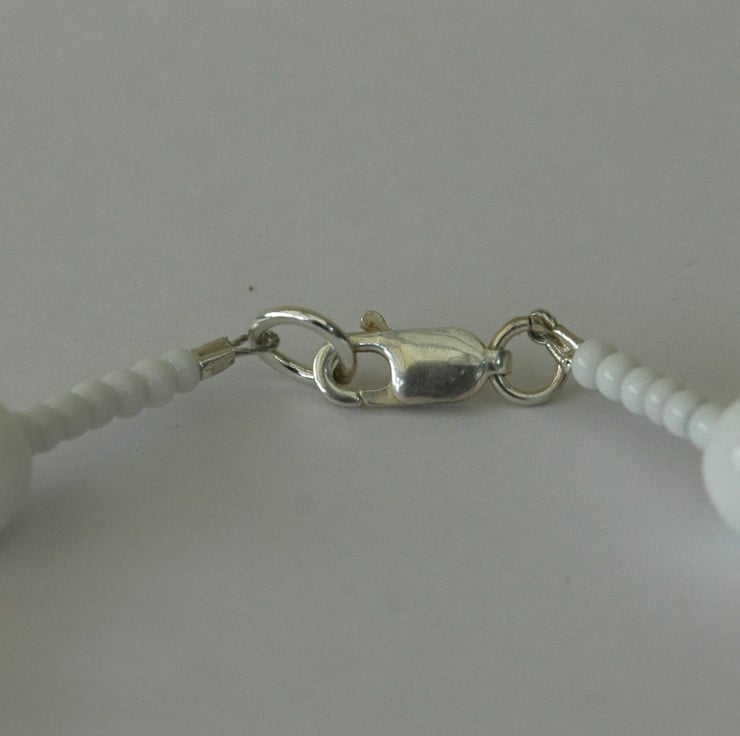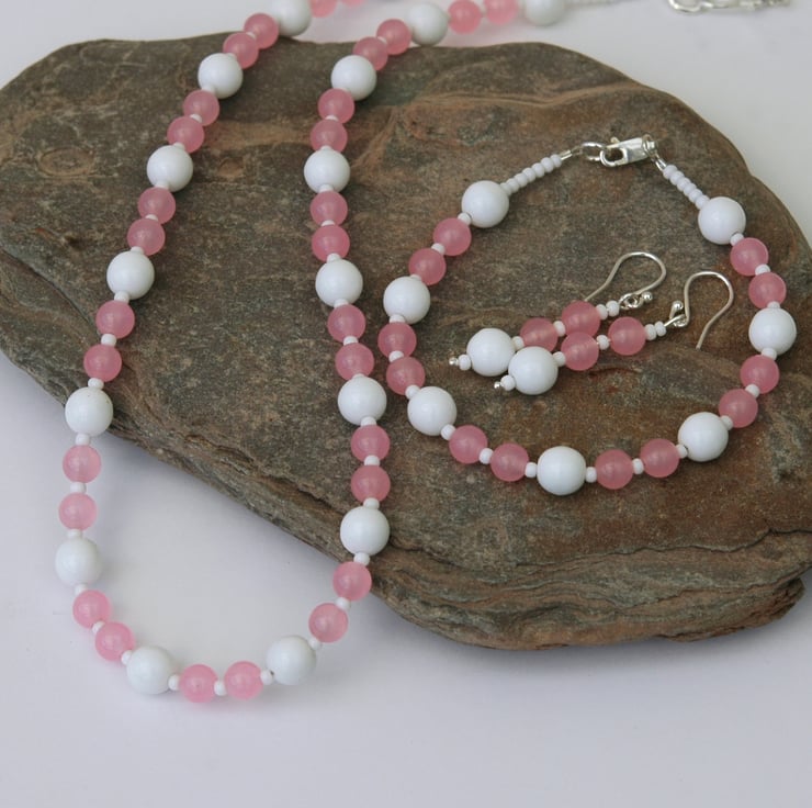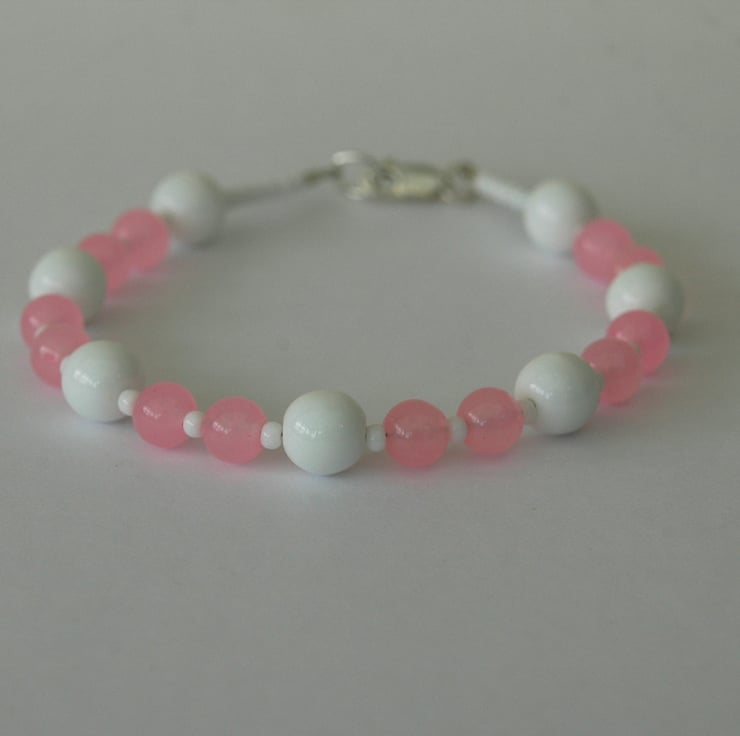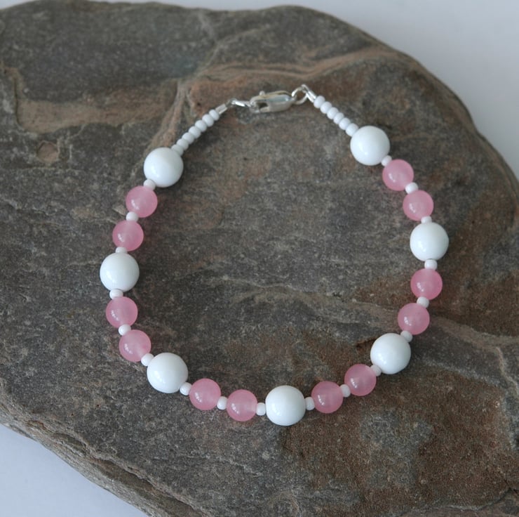 This pretty, feminine bracelet features pink rose quartz gemstone beads complemented by white glass beads and small white seed beads. It is fastened by means of a silver lobster claw clasp stamped 925 for sterling. The bracelet is 8 inches (20cm) in length so will fit a small or medium sized wrist. The Rose Quartz beads are 6mm in diameter and the white beads 8mm, threaded on silver coloured beading wire.