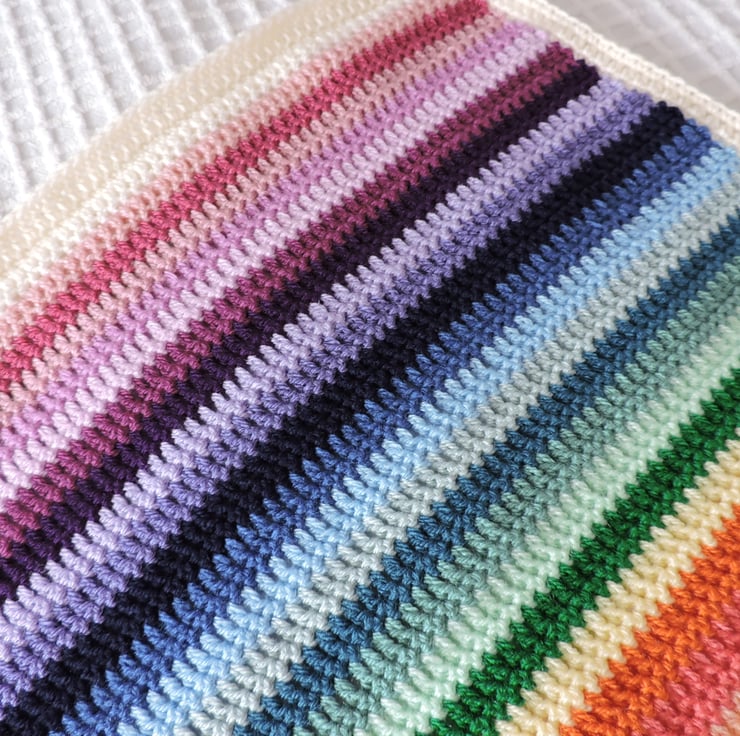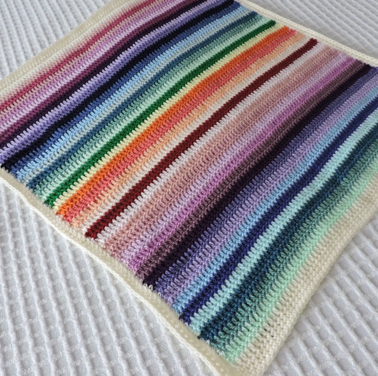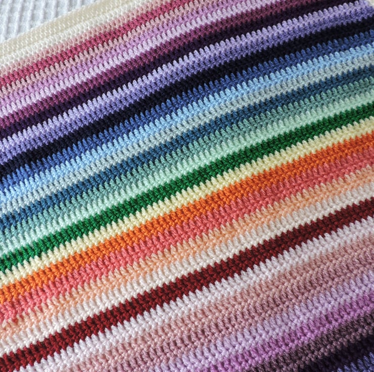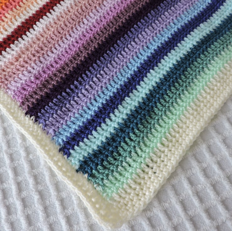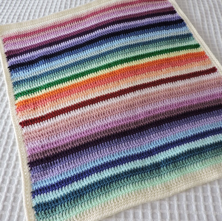 I've crocheted this colourful striped baby blanket in double knit acrylic yarns.