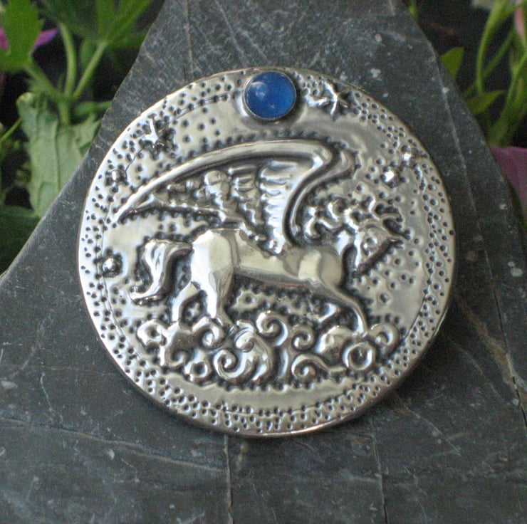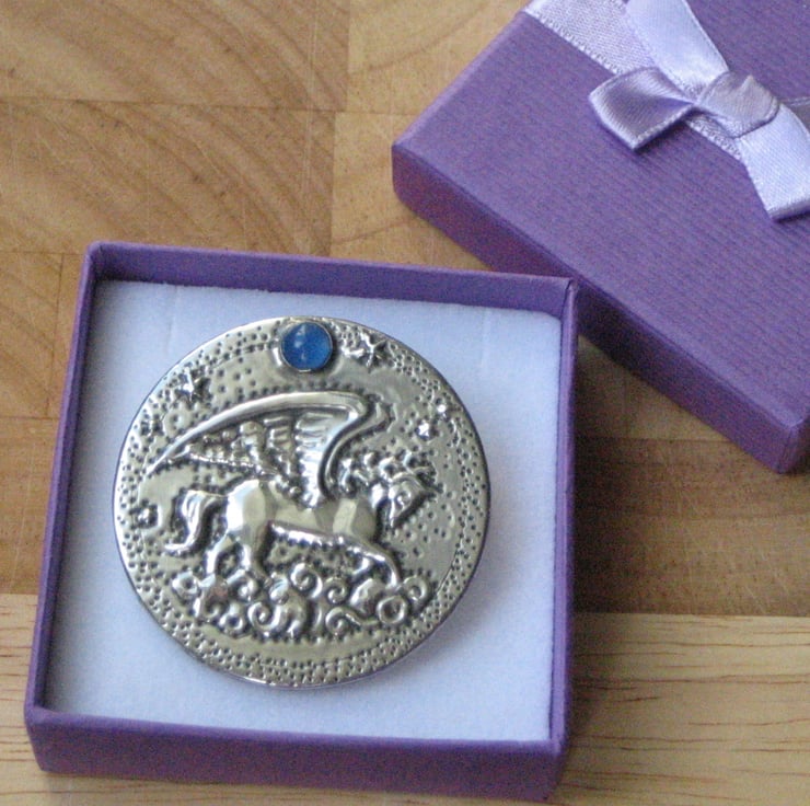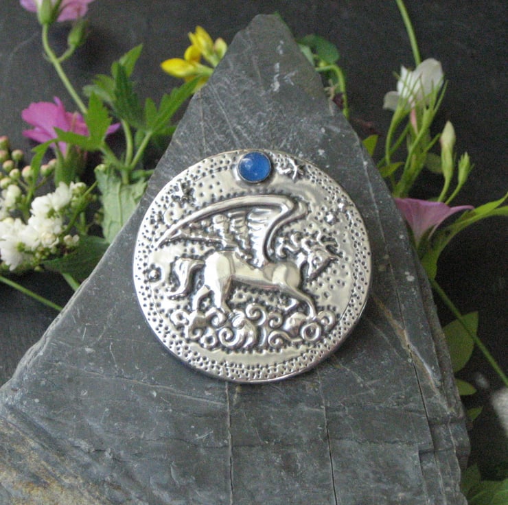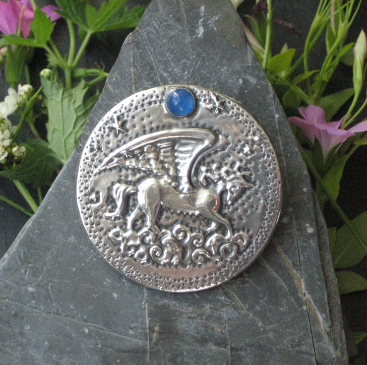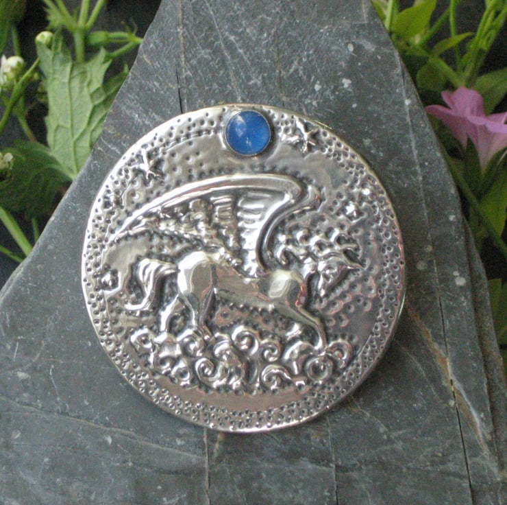 Pegasus winged horse brooch with blue agate moon handmade in silver pewter. This dramatic brooch has been crafted by hand in shiny modern pewter, using the repousse method of embossing. The mythical winged horse flies through the clouds beneath a moon of blue agate.