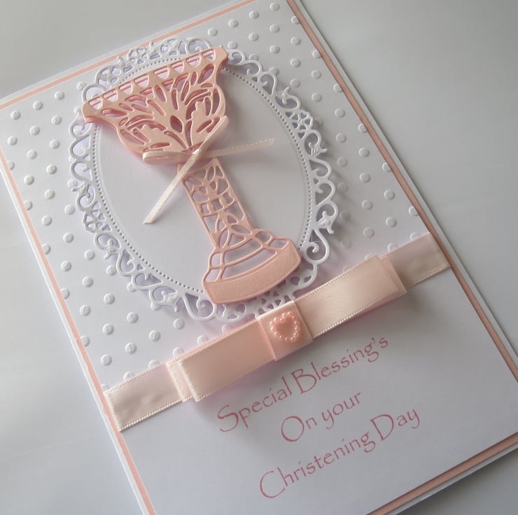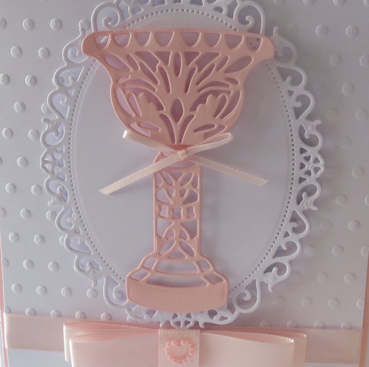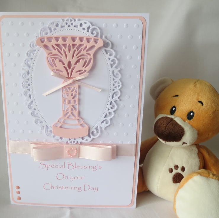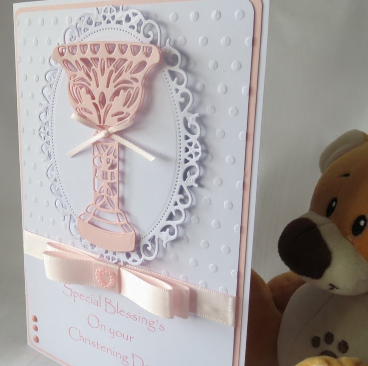 and designed with a embossed spotty background, with a Lace 3d Font and finished with a tiny satin bow and larger pleated bow and a faux pearl heart. With 3 glossy effect decoration at the bottom (teddy not included)