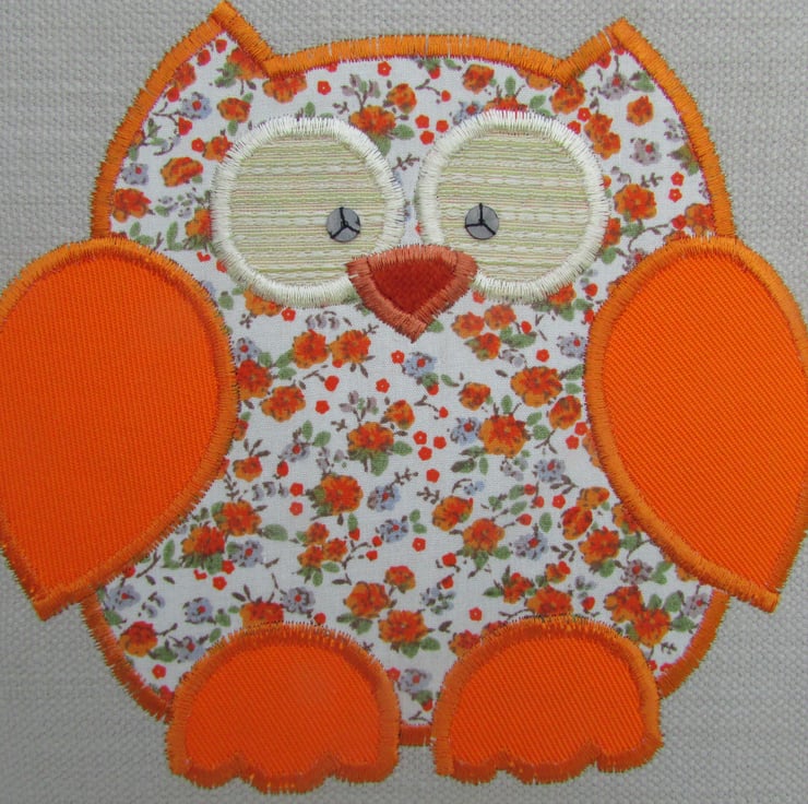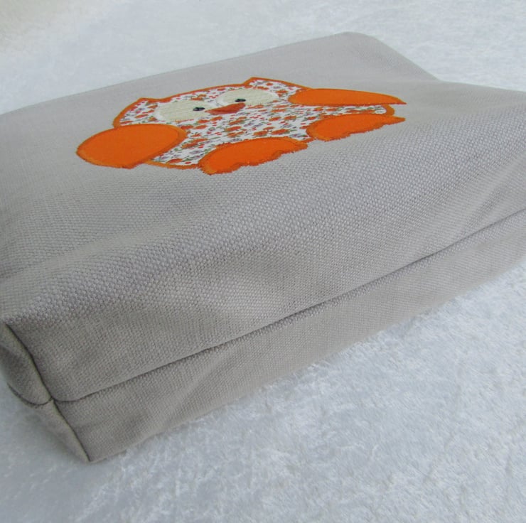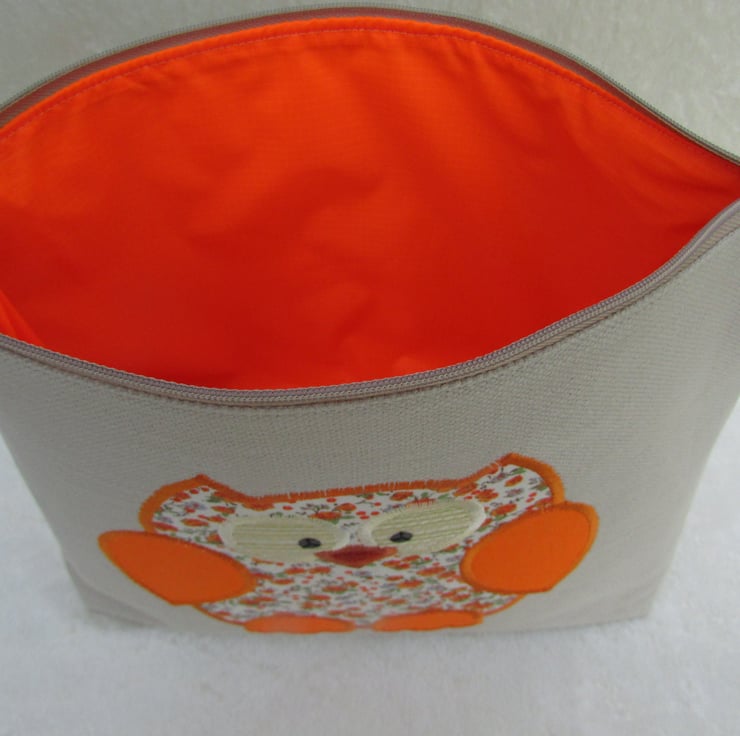 A cream toiletry bag with a cute appliqued owl in a pretty print fabric of small orange flowers and green leaves on a cream background. The owl's wings and feet are cheerful bright orange. The beak is burnt orange velvet and the eyes are cream and embellished with black sequins.