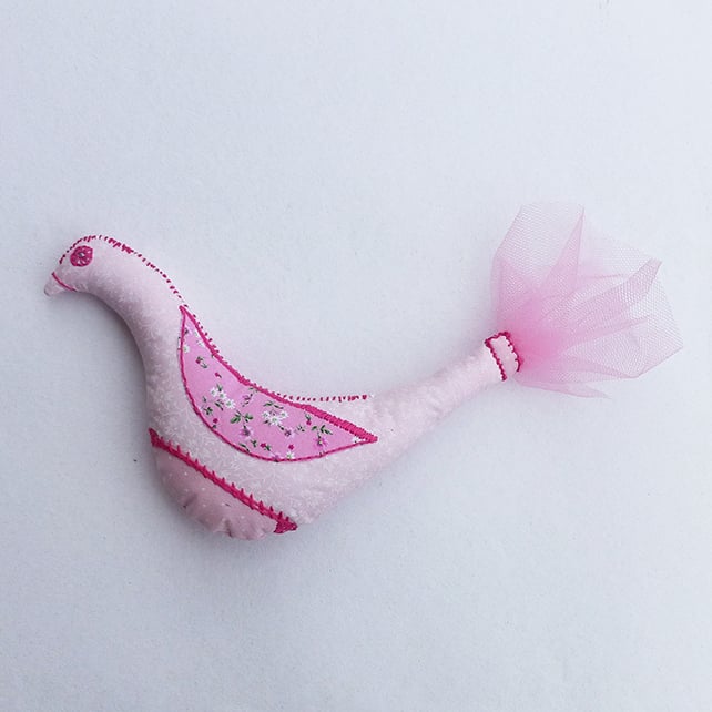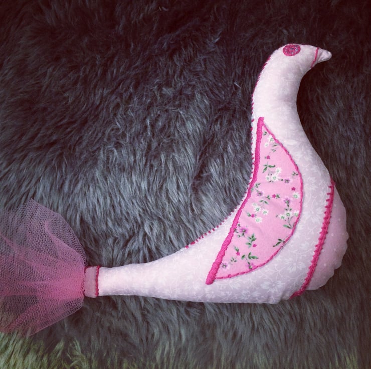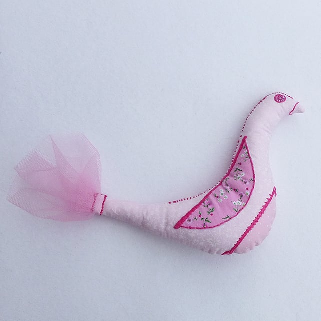She has pink and white embroidered details on her beak, wing, breast, tail and down her back and she is finished off with a mid-pink net fabric for her tail