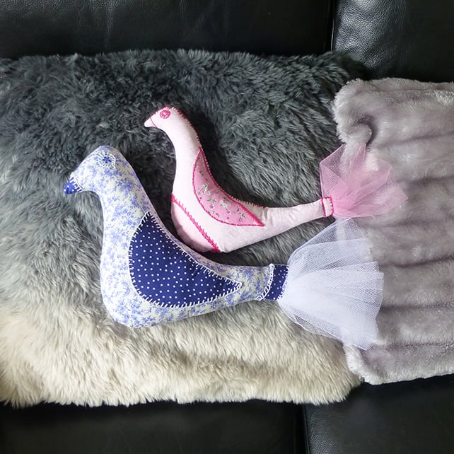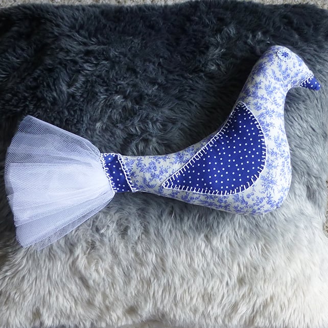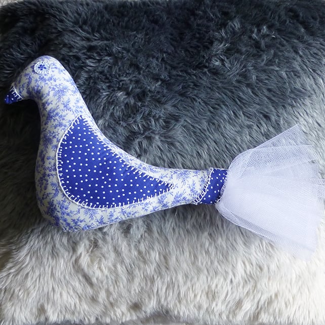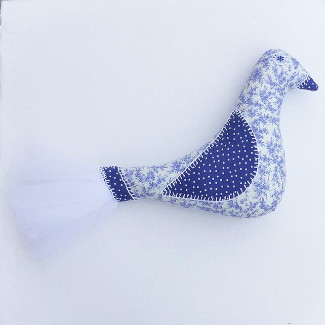 His wings, beak and tail detail are made from a navy and white spotty fabric which have been highlighted by a white embroidery blanket stitch, and he has been finished off with a showy white net tail.